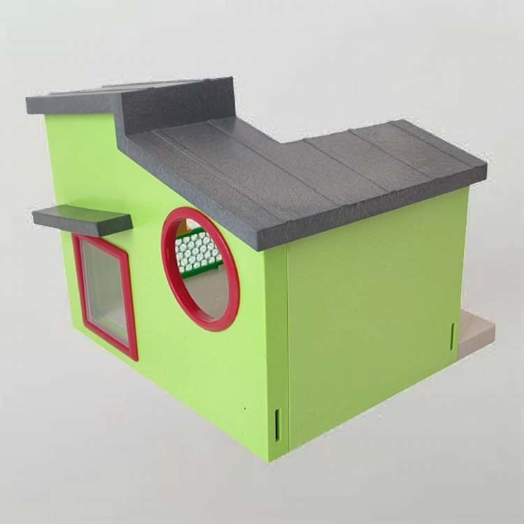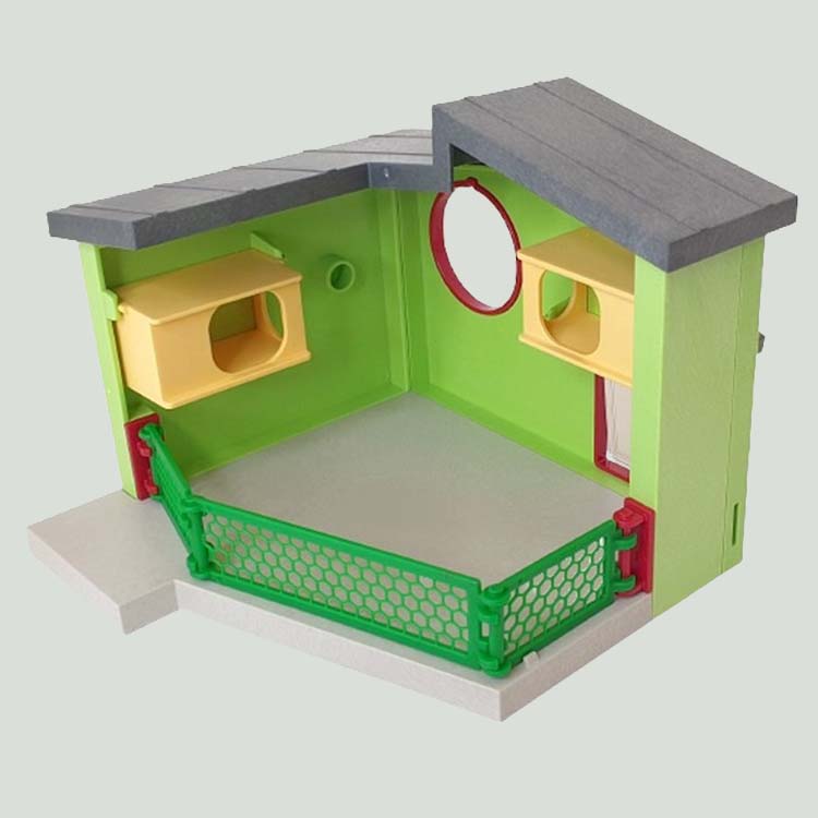 Je ontvangt dit hele dierenverblijf, een huis voor katten, honden, cavia’s of konijnen, met hekken, twee bovenhokjes + glazenklep.