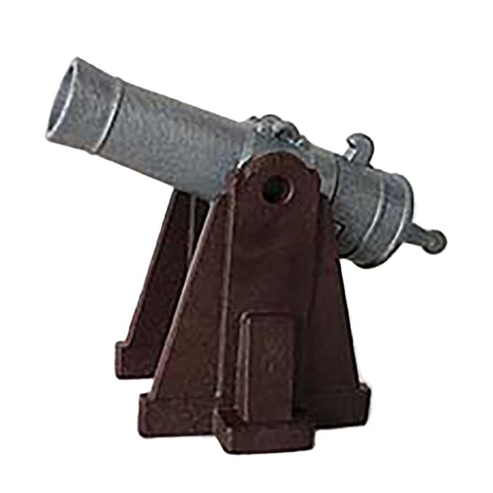 Robuust Playmobil-kanon op een massieve bruine affuit.