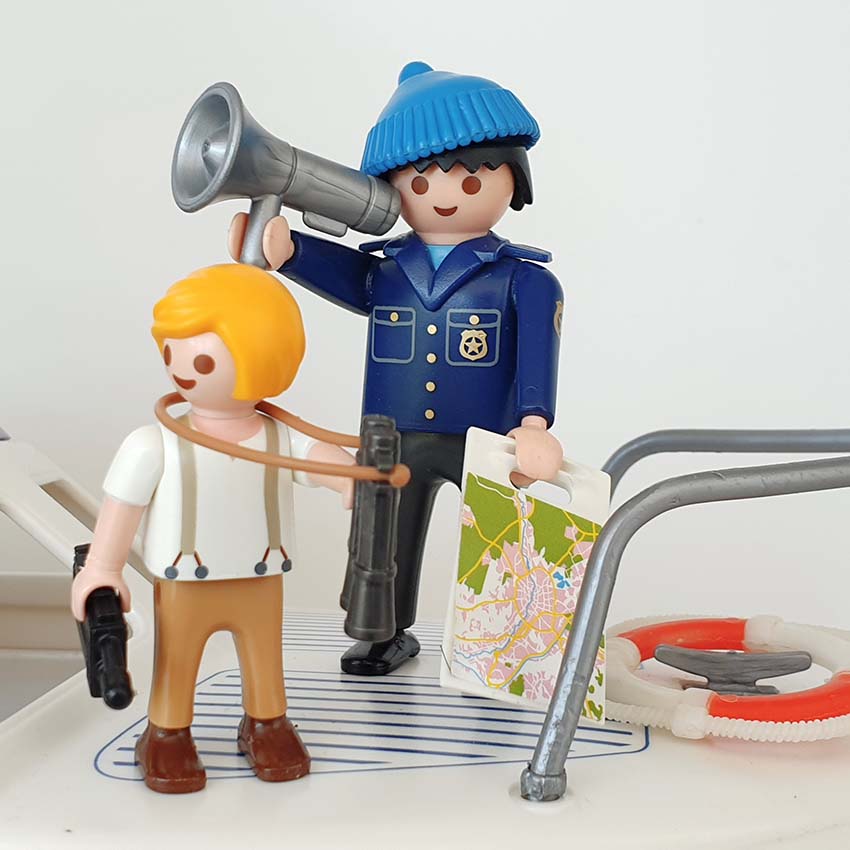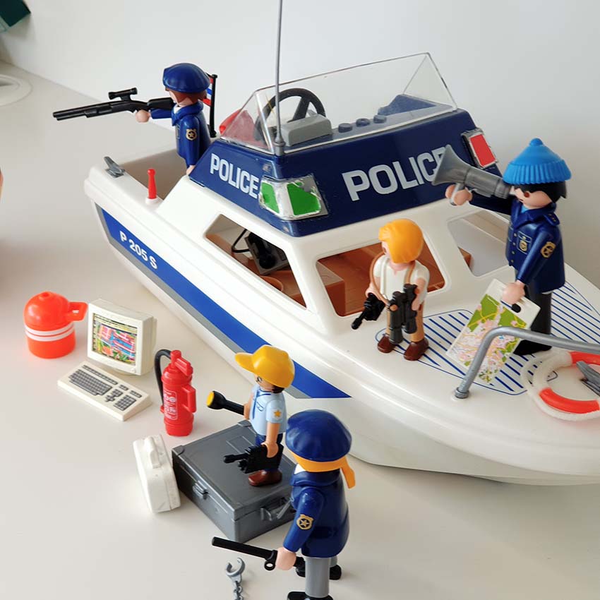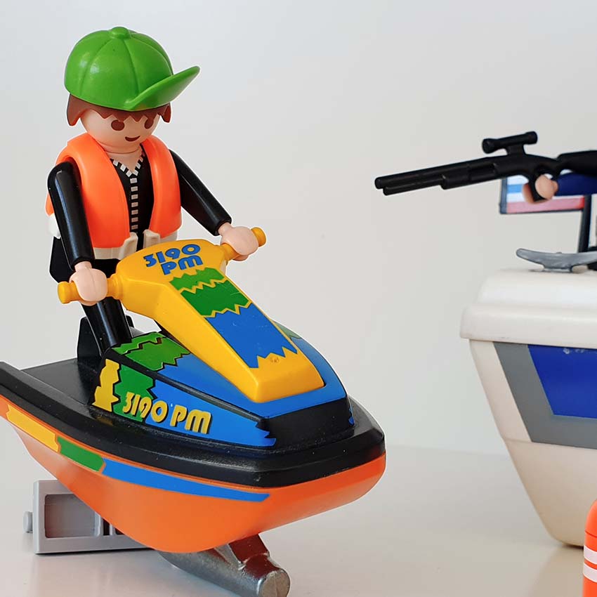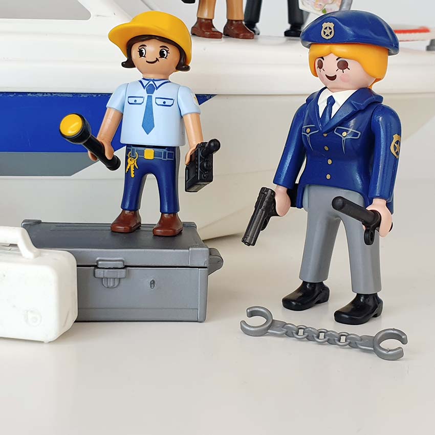 Attentie! Er probeert een bankrover via de zee te ontsnappen! Het is aan jou en de Playmobil waterpolitie om hem op te sporen en te overmeesteren. Gaat het jullie lukken? Inclusief Playmobil jetski en 4 Playmobil speelfiguren, aangevuld met een extra politieagent en 2 kinderfiguren, een politieagente en matroos, omdat we niet de kapitein meer op voorraad hebben.