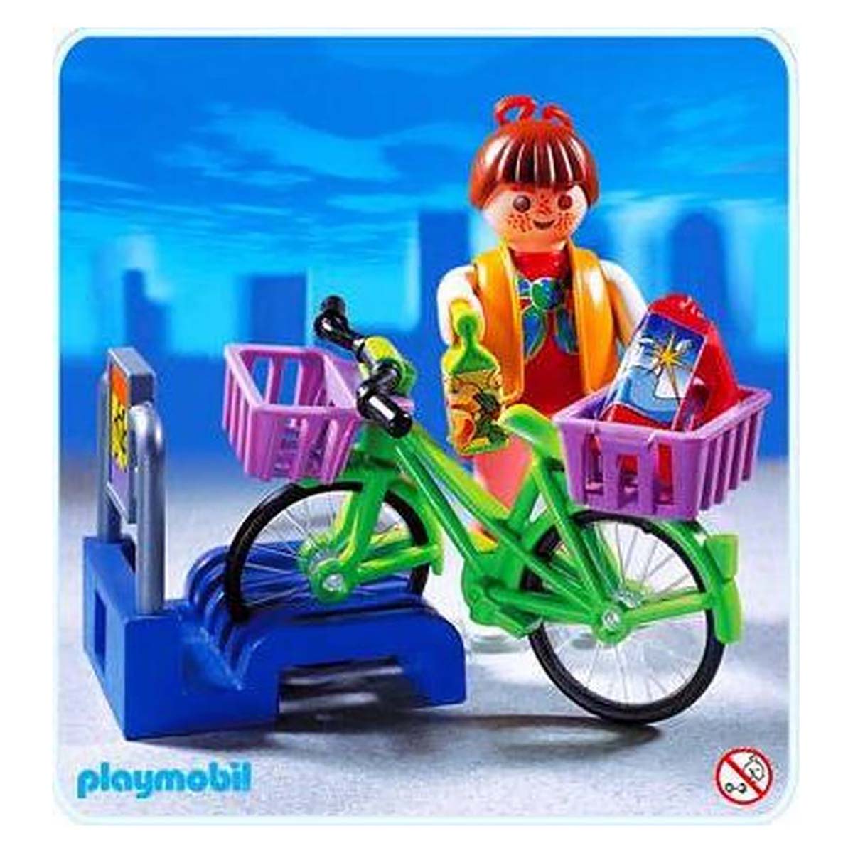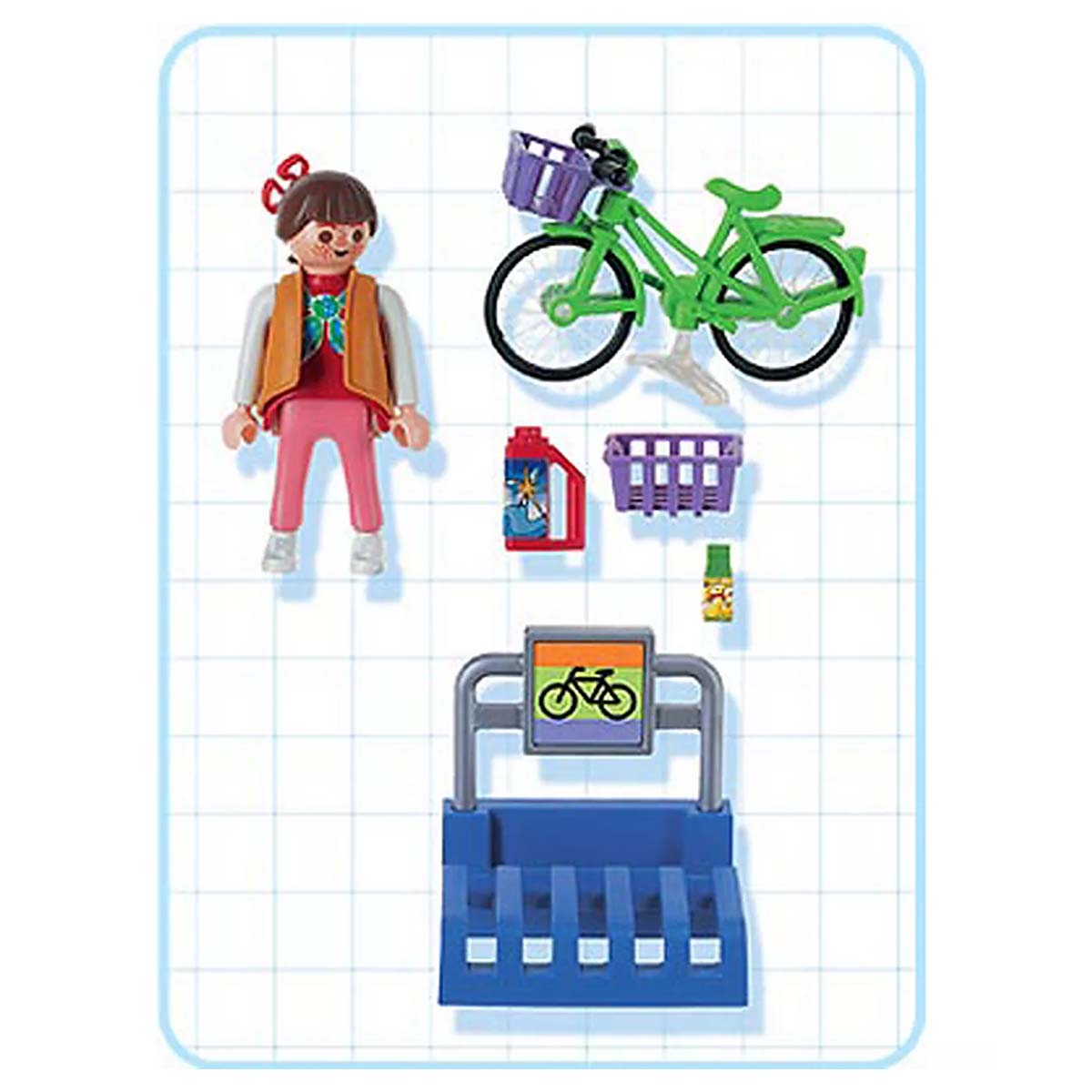 Playmobil 3203 vrouw met fiets en boodschappen. De vrouw heeft net boodschappen gedaan in de Playmobil supermarkt (art. 3200). Voor- en achterop haar fiets heeft ze handige mandjes. Inclusief fietsenrek.