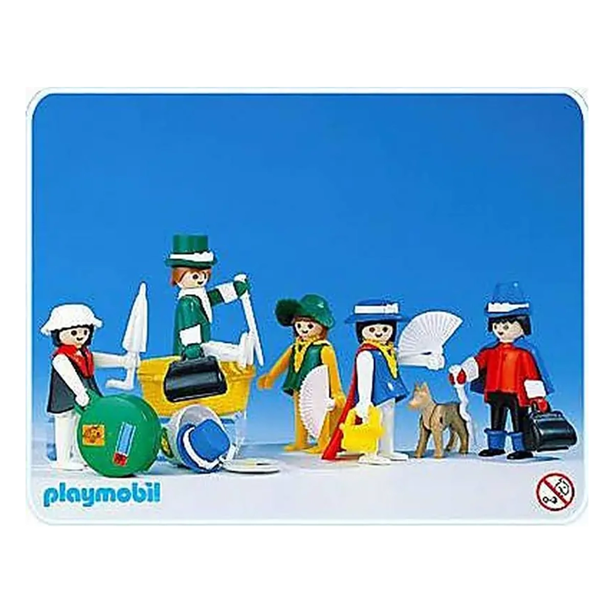 Deze set bevat 5 playmobil speelfiguren met hoeden, manden, koffers en een hond.