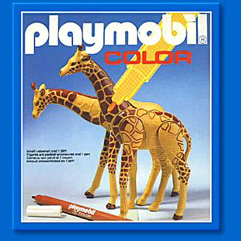 Playmobil 3672?Color giraffen. De Playmobil color serie bestond?uit sets die?? op gezichten en?kapsels na ??in het wit geleverd werden. In de set zaten?watervaste kleurstiften waarneem je de sets?vervolgens?naar eigen ontwerp zelf?kon inkleuren. Deze set bevat 2?Playmobil giraffen?en 1?kleurstift.