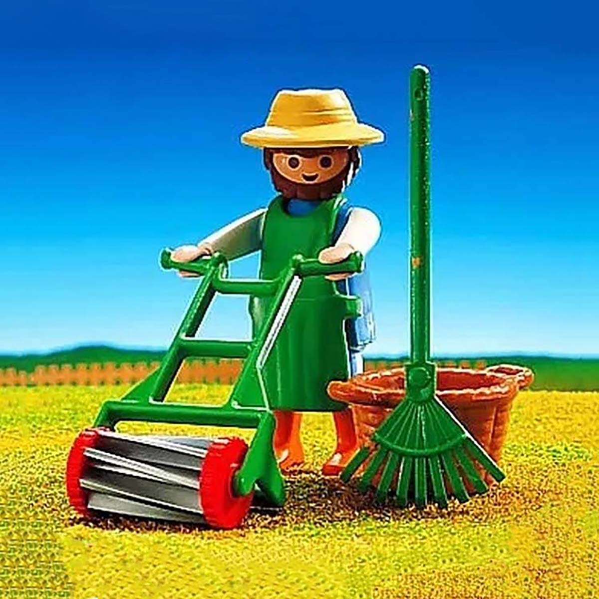 Playmobil tuinman met baard, strohoed en groene schort, compleet met klassieke handgrasmaaier, hark en mand. Perfect voor het aanvullen van boerderij-, tuin- en buitenleven-thema’s. De felgroene maaier en accessoires maken deze set ideaal voor speelscènes rond tuinonderhoud en landleven.