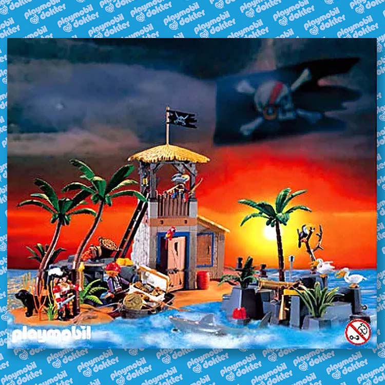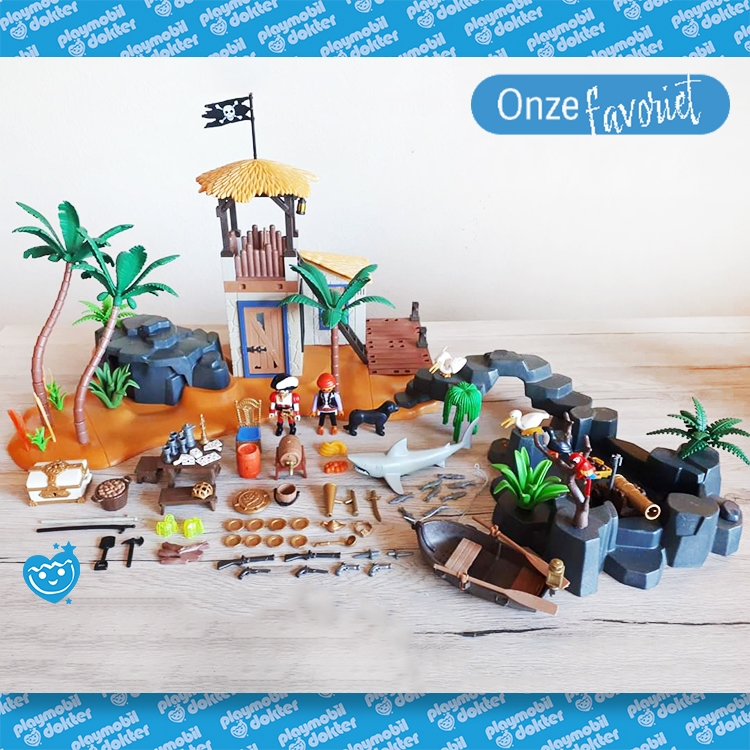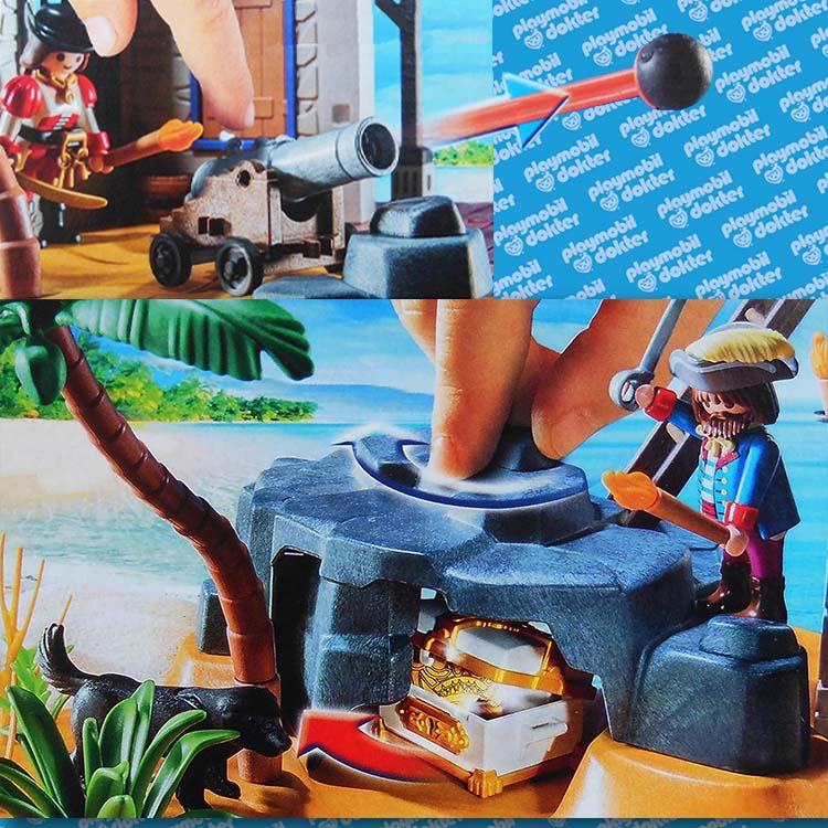 Eindelijk hebben de Playmobil piraten de beroemde schat in het scheepswrak / de Piraten Lagune ontdekt en met de roeiboot naar hun eiland verscheept. Argwanend houden de piraten vanuit de uitkijkpost een oogje in het zeil. Er zijn nog meer kapers op de kust om de schat te stelen. Gelukkig beschikken de piraten over een echt schietend kanon om de schat te verdedigen.
