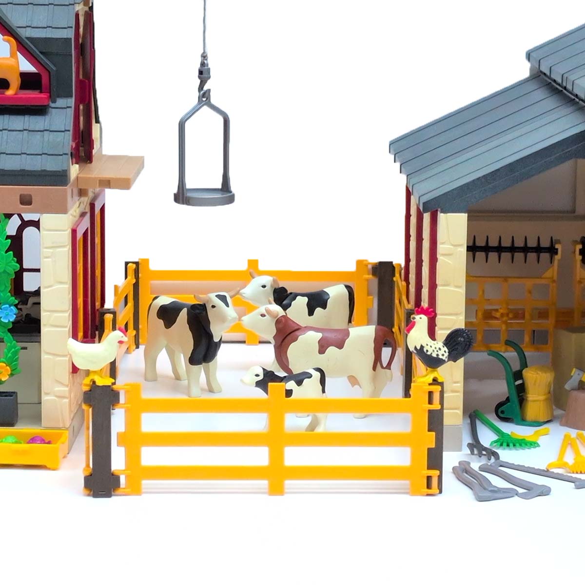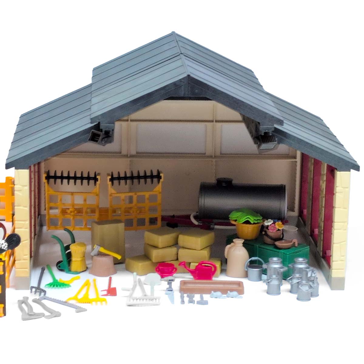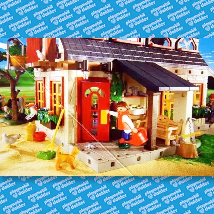 De boerderij is 49 cm lang, 27 cm breed en 28,5 cm hoog. De schuur is 38 cm lang, 32 cm breed en 25 cm hoog. Handleiding. De keuken van de boerderij bevat o.a. een geintegreerde afwasmachine, een gasfornuis met afzuigkap en een bakplaat. Bovendien bevat de boerderij 2 bedden, 2 tafels, 2 stoelen, een lamp, 4 borden, 2 kopjes, 2 emmers, 4 vorken, messen en lepels, een aangesneden pruimenvlaai, boeken, een tuinbank, een motorzaag, een kruiwagen, een omheining, en landschapplaat met gazon en een boom, een hark, een riek, 2 mestvorken, een hooivork, en gieter, een pompoen, een hakblok, 6 strobalen, een mand met aardappelen, 3 emmers, 1 korf, 3 kisten en 5 melkbussen.