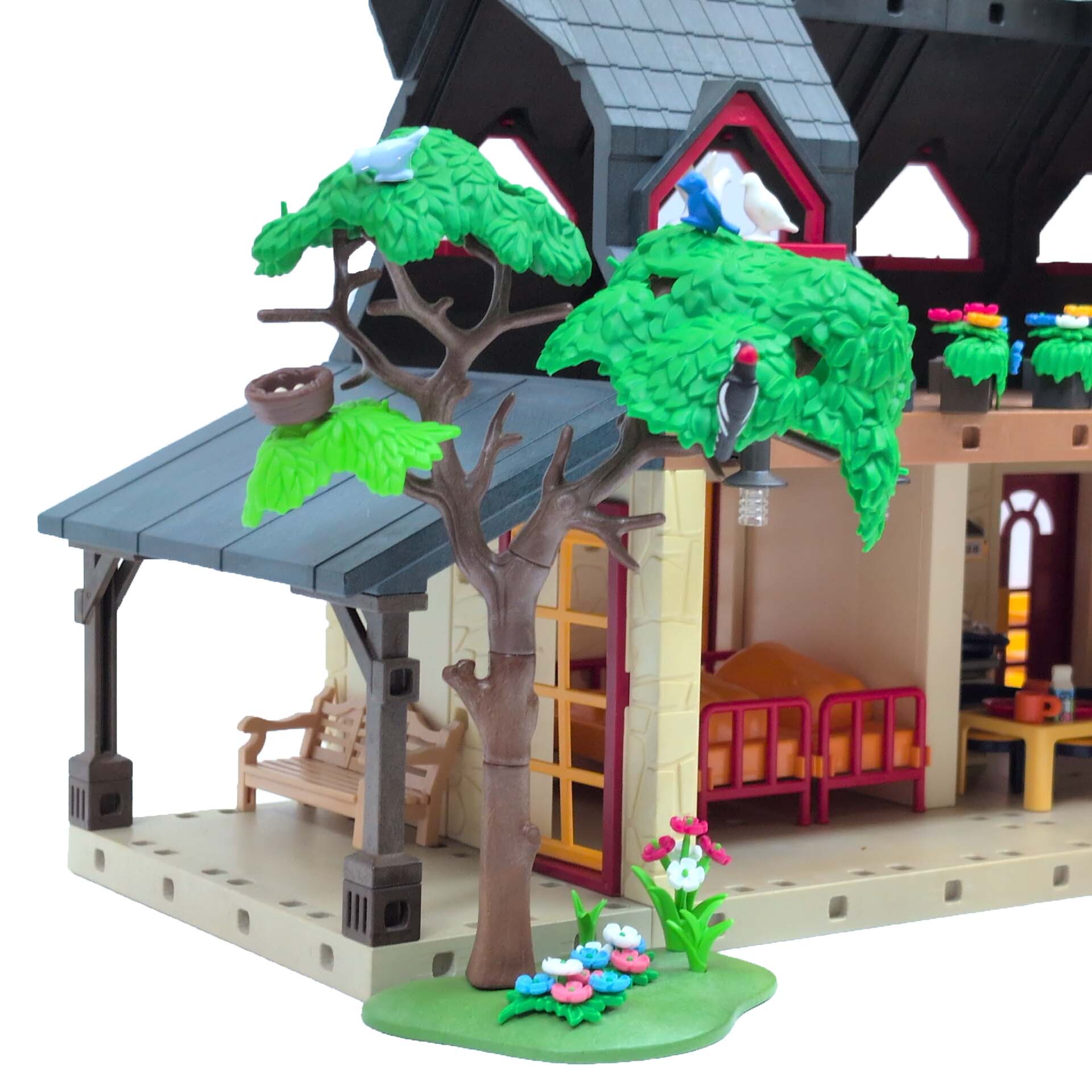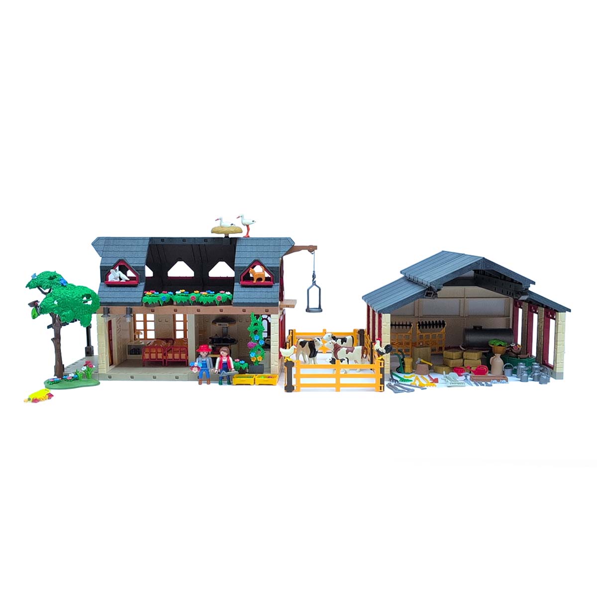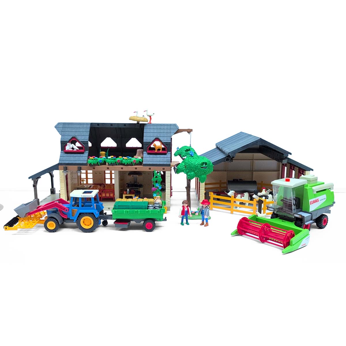 Met behulp van een takel kunnen voorraden eenvoudig op deze zolder opgeslagen worden. De combine is voorzien van een mechanisme om strobalen te kunnen werpen en de frontlader van de tractor is beweegbaar. De tractor is een modeluitvoering van de originele Claas Lexion 600. Aan deze tractor kunnen diverse accessoires, zoals een eg, een ploeg en een navulbare watertank voor de dieren bevestigd worden. Naast de boer en de boerin bevat deze luxe set diverse meubels, werktuigen, een kruiwagen, een boom, diverse levensmiddelen, 4 koeien, een kat, een gans, een eend, een haan, een hond, 2 ooievaars met nest, 2 muizen, 3 vogels en 2 duiven.