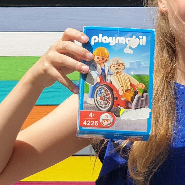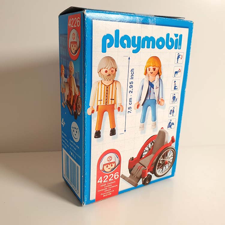 Dit Playmobil ziekenhuis setje bevat een opa in een rolstoel en een verzorgster. De banden zijn helaas niet meer verkrijgbaar bij Playmobil. Maar de doos is perfect en set is goed speelbaar.