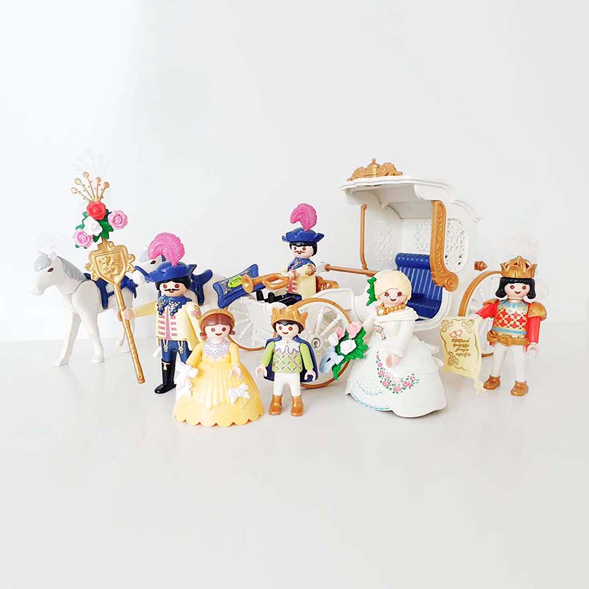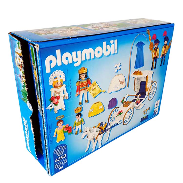 Deze sprookjesachtige koets vervoert het gelukkige bruidspaar naar het sprookjeskasteel. De set bevat onder meer een koets met 2 witte paarden, 2 lakeien, 2 bruidskinderen en natuurlijk prachtige kleding.