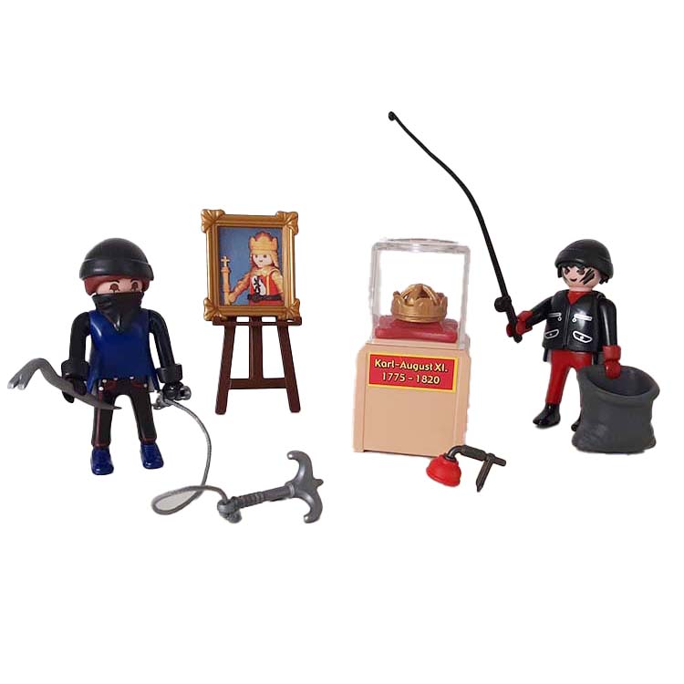 Deze Playmobil juwelendieven stelen de kroon van de koning. Een Playmobil inbreker gebruikt een hengel om de kroon uit de glazen kast te vissen. De andere dief staat op de uitkijk. Als het deksel beweegt gaat de alarm af. Inclusief benodigde batterij. Deze set staat ook bekend onder Playmobil set nummer 6281.