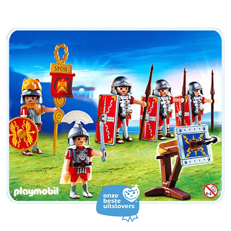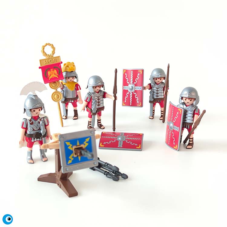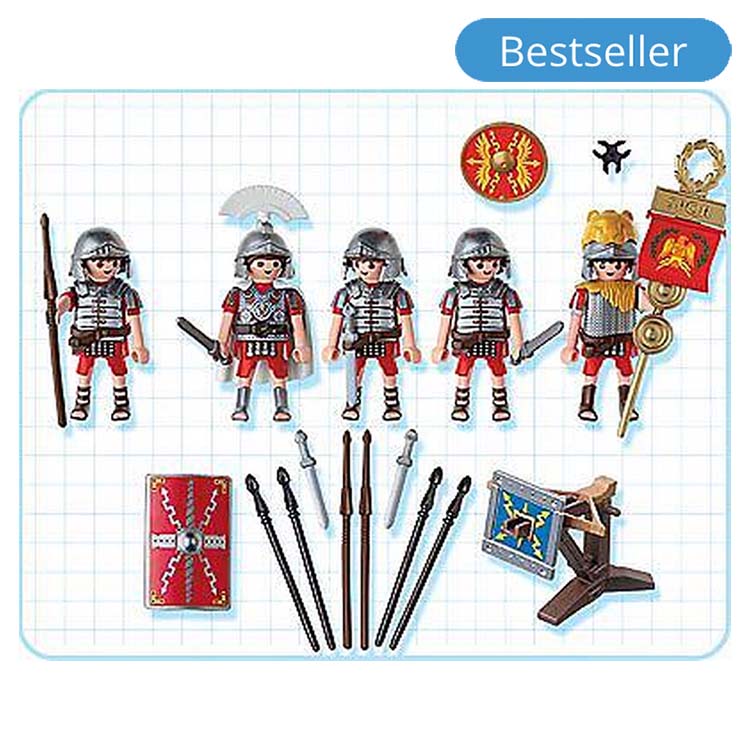 Maak je Romeinse Rijk compleet met dit Romeins legioen. Deze 5 Romeinse soldaten zijn gereed voor de strijd. Ze komen met zwaarden, speren, schilden, banier en katapult. Katapult met een