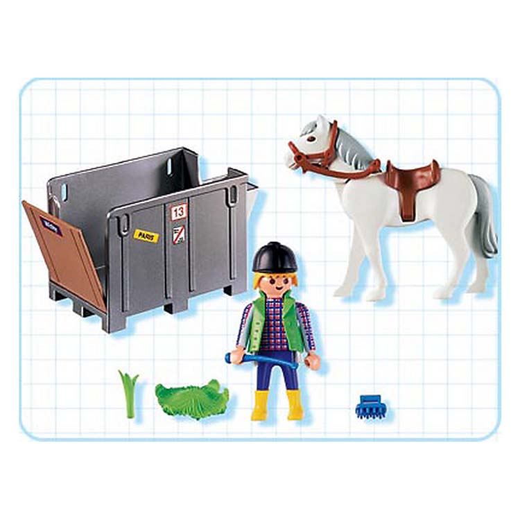 De Playmobil paardenverzorger zorgt ervoor dat het paard veilig in het vliegtuig vervoert kan worden in de vliegbox. Inclusief voer en borstel.