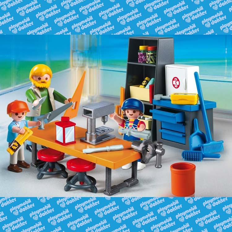 Breid je Playmobil school uit met dit praktijklokaal. De handjes uit de mouwen! Deze werktafel heeft inklapbare poten. Inclusief kolomboor, schroevendraaier, bankschroef, zaag, houtlijm en EHBO kastje met verband en pleisters.