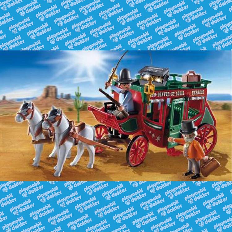 Deze Playmobil Postkoets met koetsier vervoert de bankdirecteur met zijn kist met gouden munten. Het dak van de koets is afneembaar. Inclusief 2 paarden en diverse accessoires.