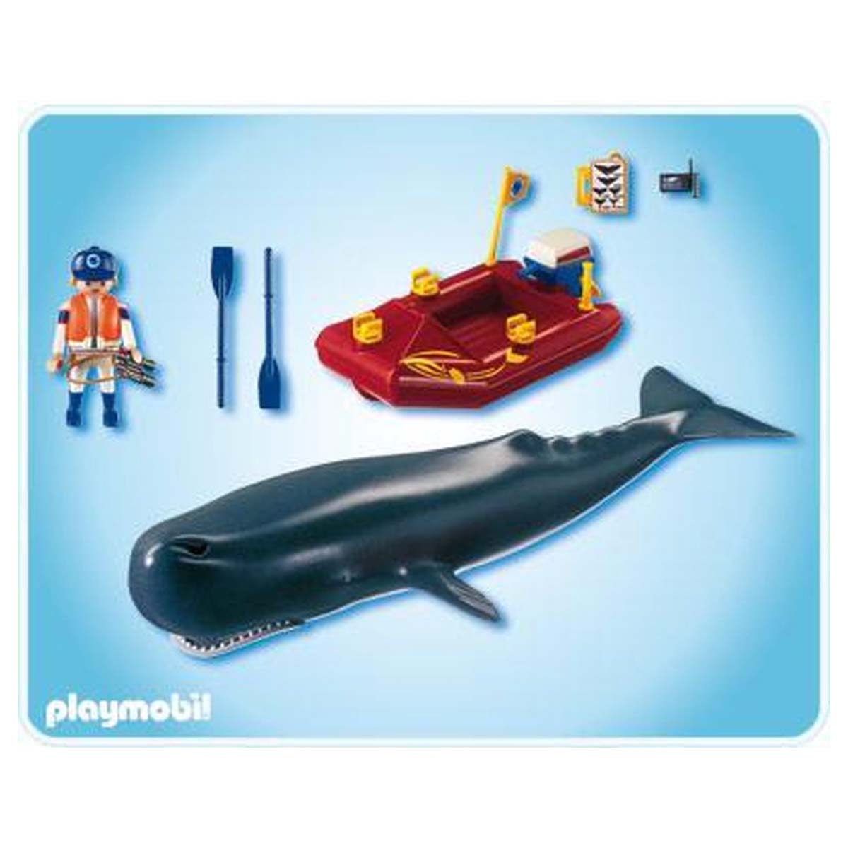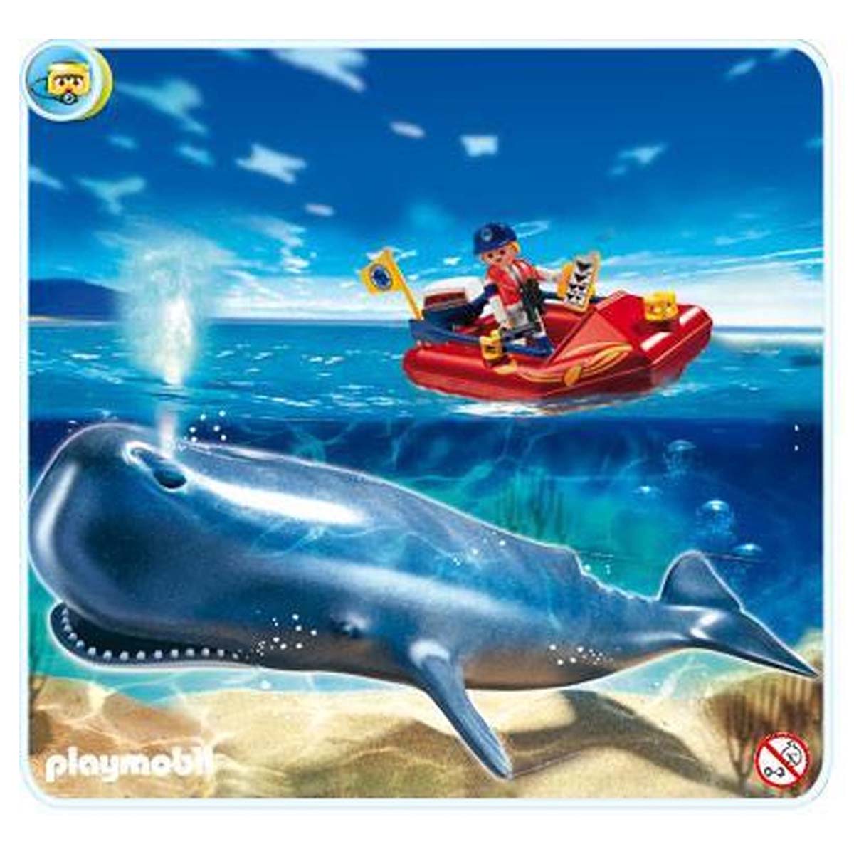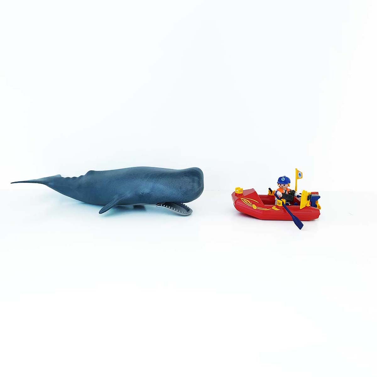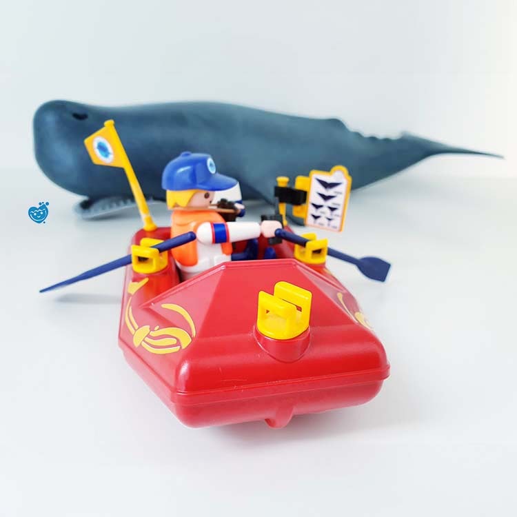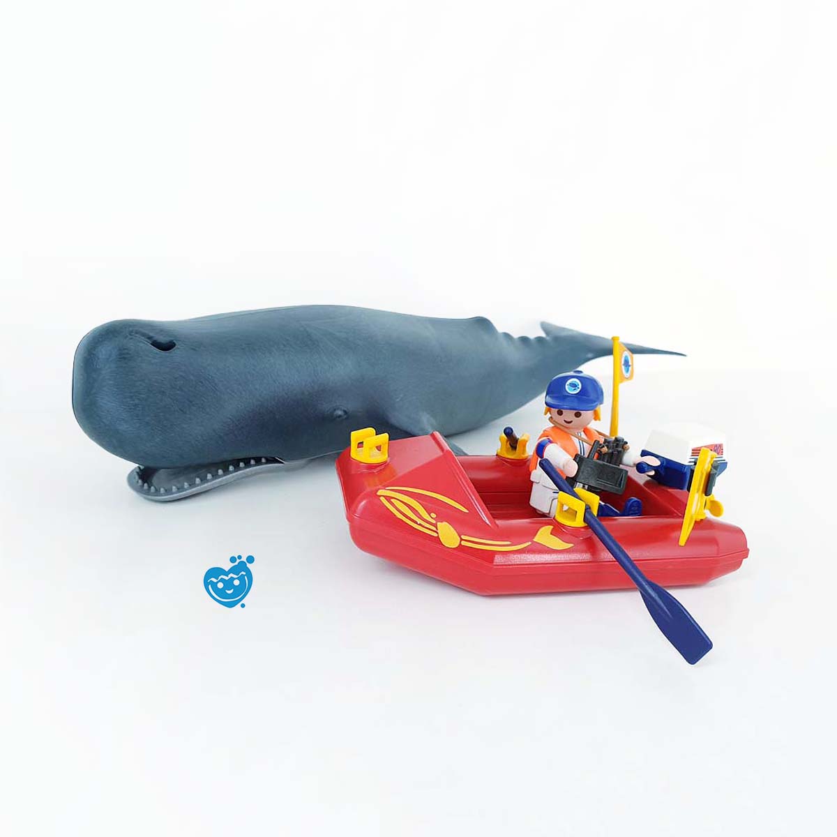 Snel vaart de Playmobil zeebioloog met zijn rubberboot dichterbij. Hij wacht tot de Playmobil walvis weer opduikt om te ademen zodat hij aan de staart kan zien welke walvis het is. Deze set van Playmobil bevat o.a. een potvis, een rubberboot, een onderzoeker en diverse andere leuke accessoires