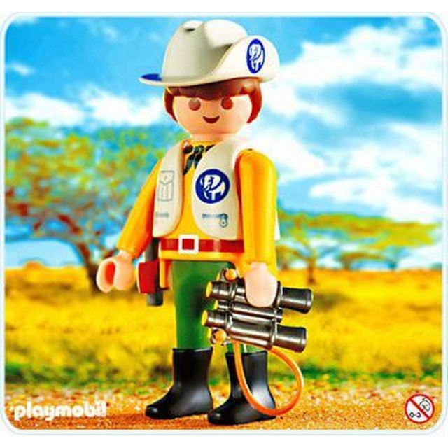 Deze ranger houdt de wild dieren in het natuurreservaat goed in de gaten. Inclusief verrekijker en pistool.
