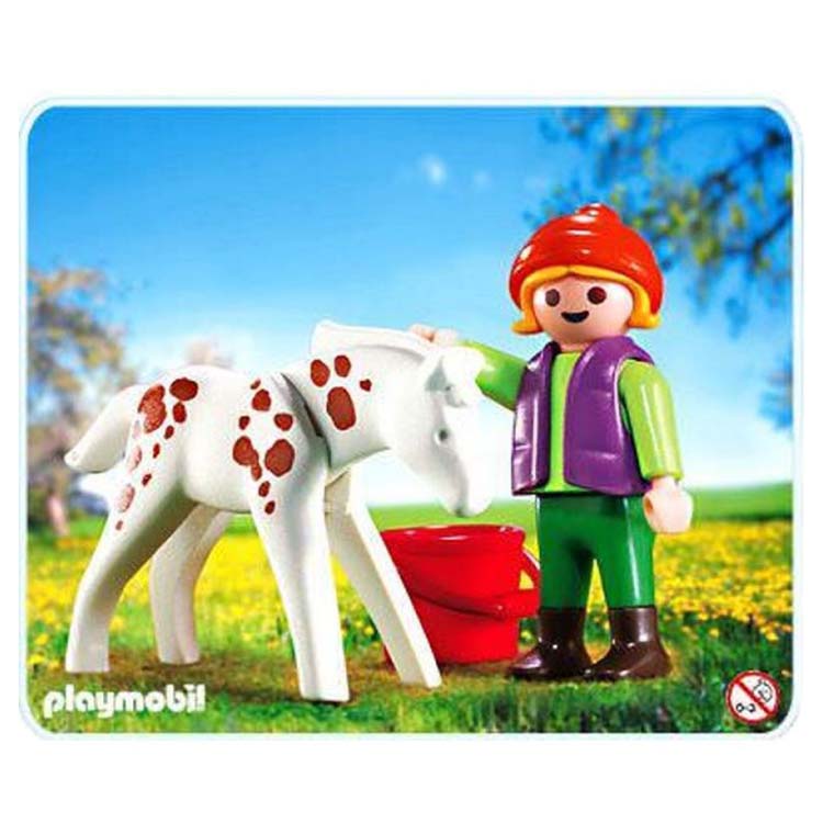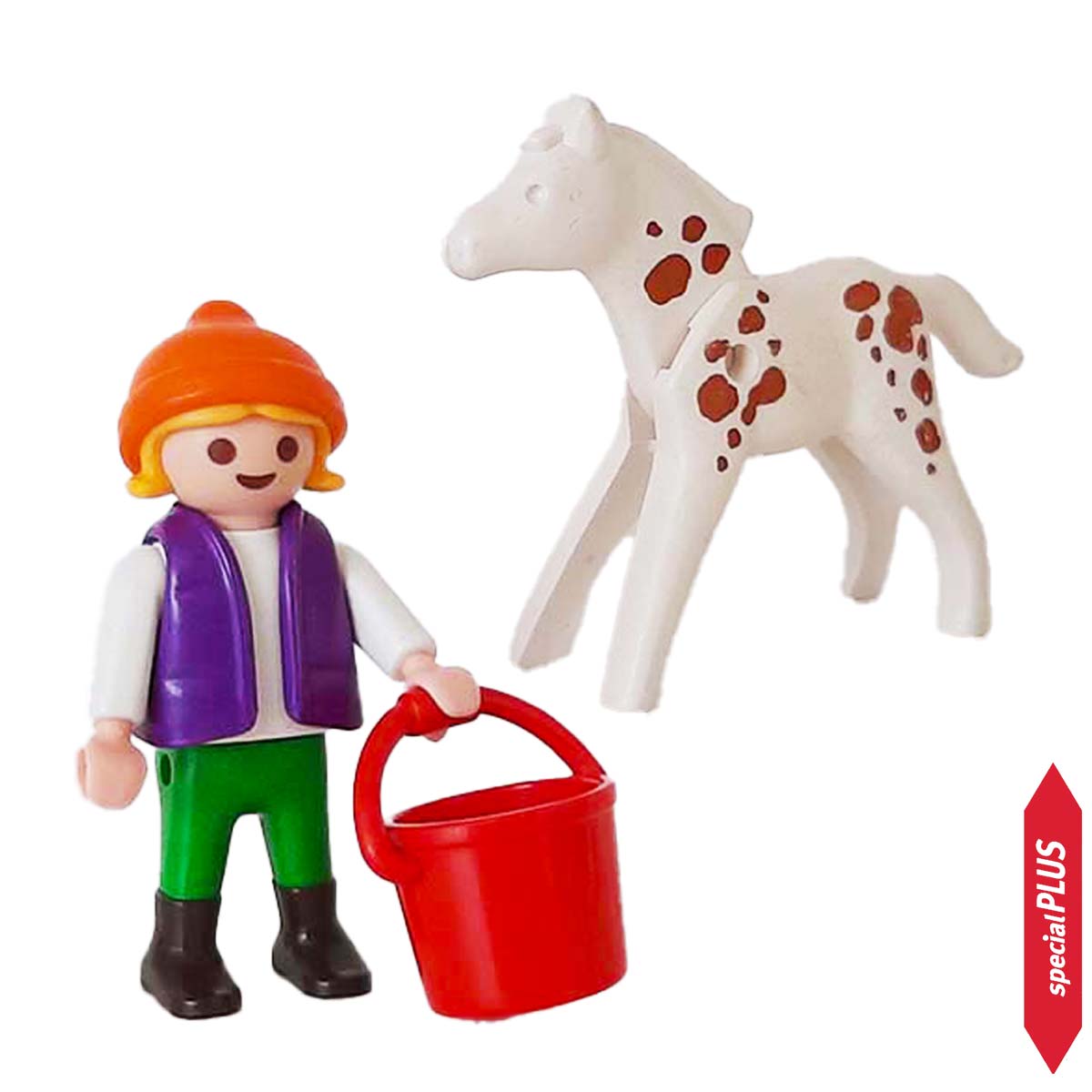 Dit meisje verzorgt haar Playmobil veulen. Inclusief emmer.