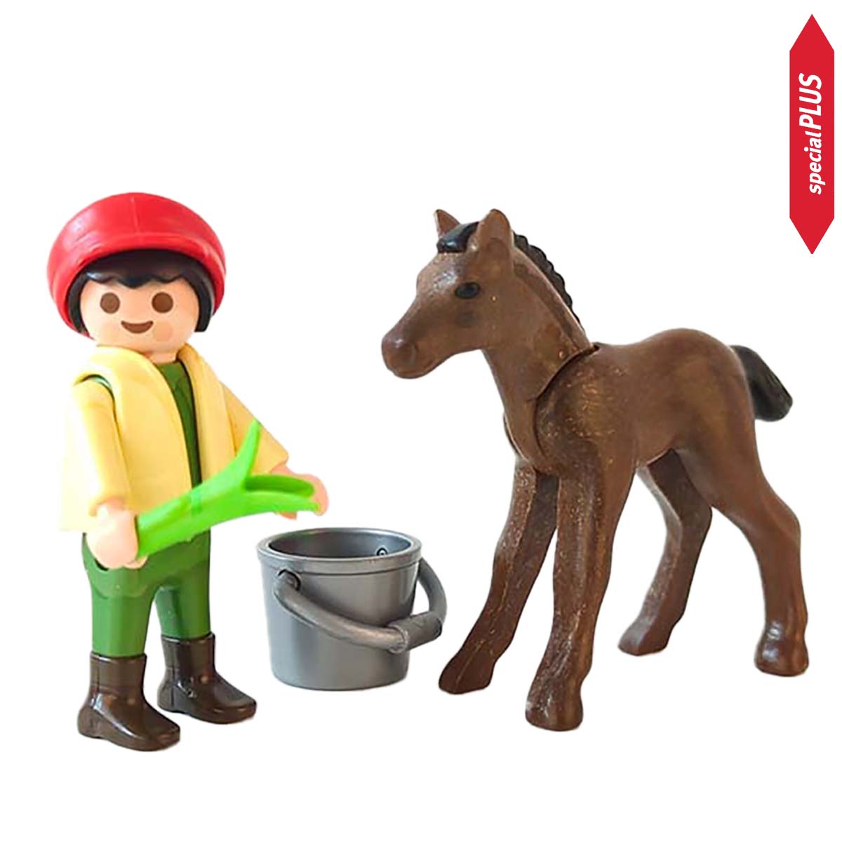Deze jongen voert zijn Playmobil veulen. Inclusief voer en emmer.