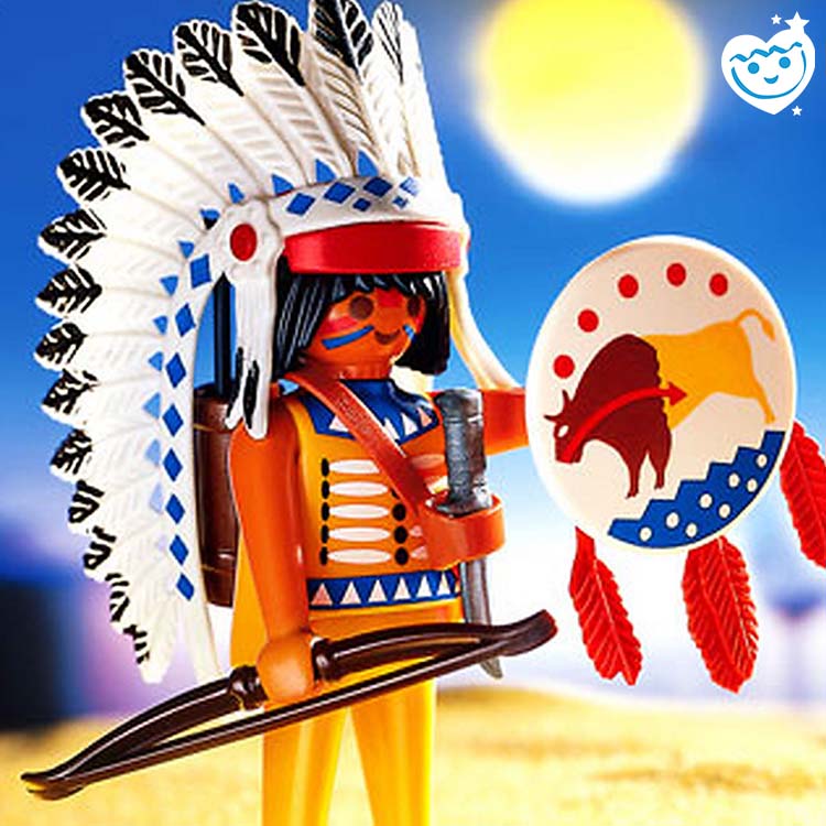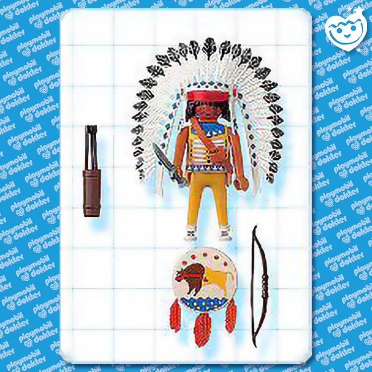 Dit stoere Playmobil opperhoofd bewaakt het indianendorp dag en nacht. Inclusief verentooi, dolk, pijl en boog.