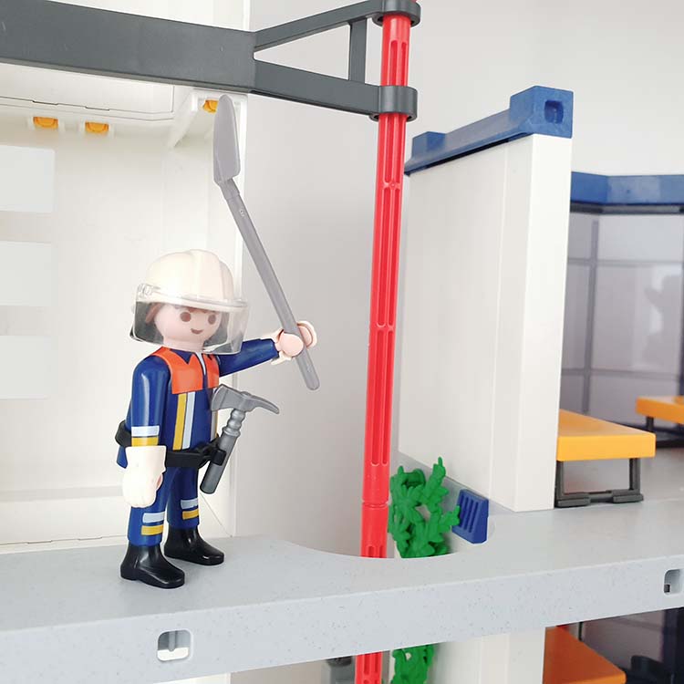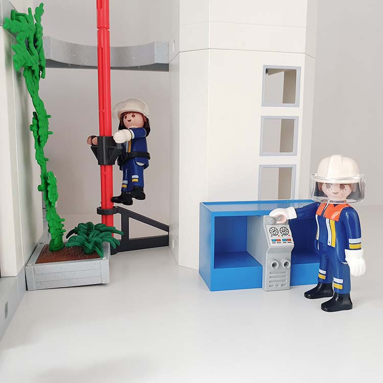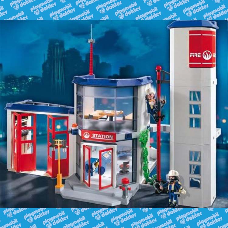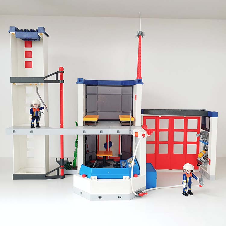 Playmobil 4819 brandweerkazerne met brandweerpaal en grote garagepoort voor de brandweervoertuigen. De brandweerlieden kunnen echt glijden van de paal. Inclusief 2 Playmobil brandweermannen.