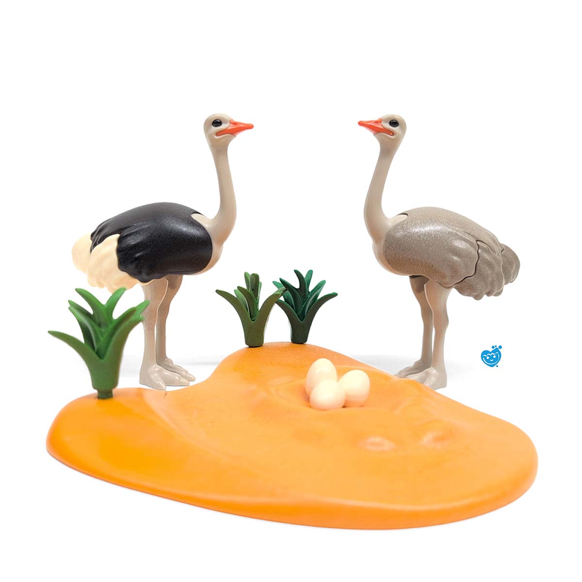 Deze Playmobil struisvogels zijn dolblij: drie struisvogeleieren hebben ze! Nu maar afwachten of het jongetjes of meisjes worden! Ondertussen zorgt het mannetje goed voor het vrouwtje, door haar lekkernijen te brengen, haar gezelschap te houden en natuurlijk door boze indringers weg te jagen.