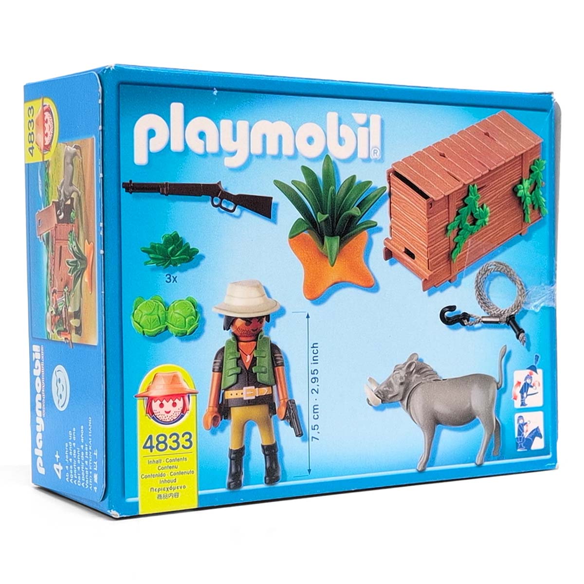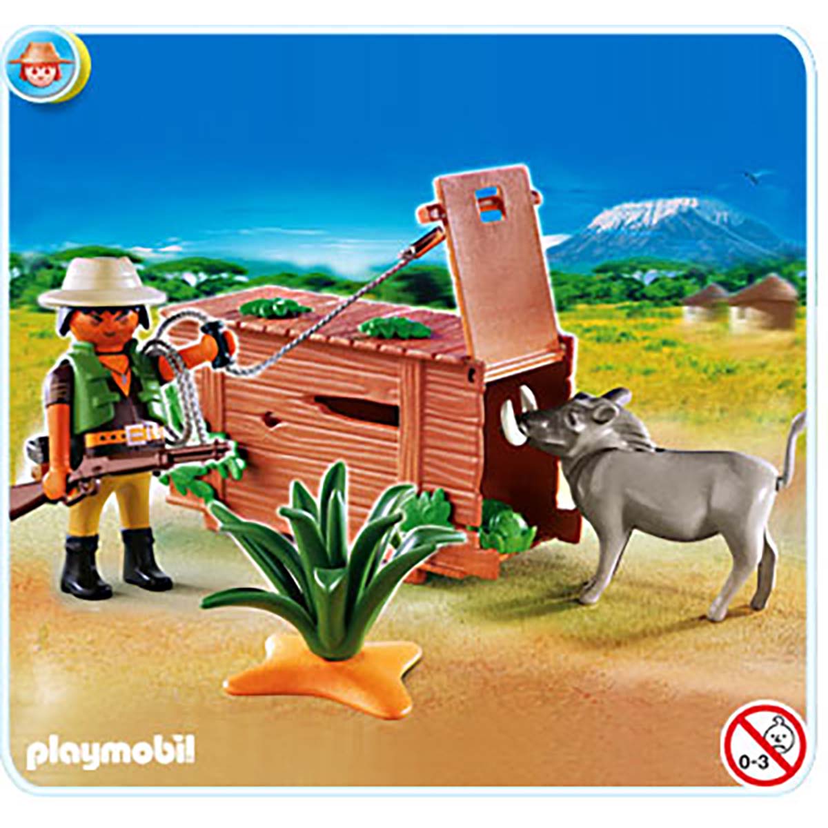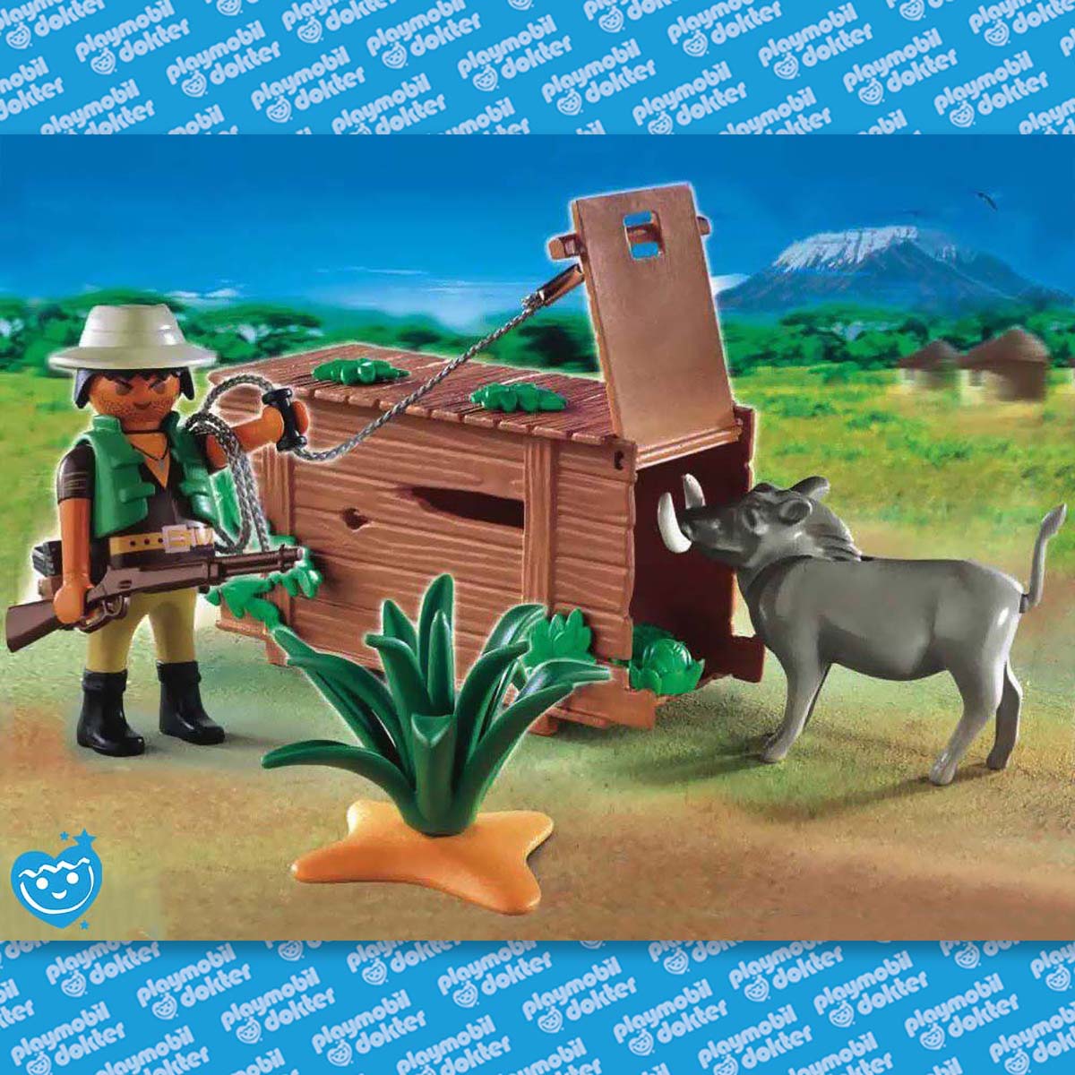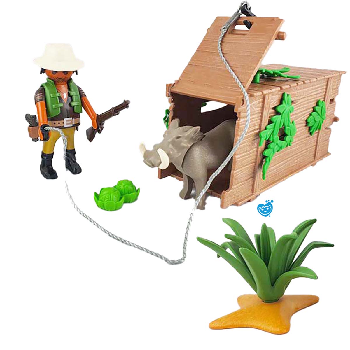 Deze Playmobil set bevat een stroper met val en een wrattenzwijn. De val kan op afstand gesloten worden door met het touw het valluik dicht te trekken. Met diverse accessoires, waaronder planten en geweer.