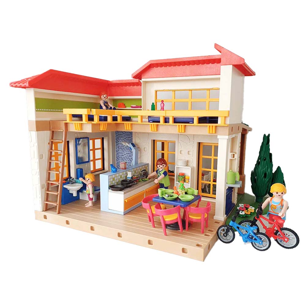 Dit uitgebreide Playmobil 4857 vakantiehuis is ingericht met keuken, woon-, bad- en slaapkamer voor de hele familie. Inclusief terras met tuinmeubelen en barbecue. Voorzien van vele accessoires zoals fietsen, stoelen, tafels en bedden. Inclusief 4 Playmobil speelfiguren. Ik ben fan! Jij ook? Oh ik verlang zo naar de zomers samen met het gezin even lekker er tussenuit. Fietsen, lange badderen en Barbecuen heerlijk!