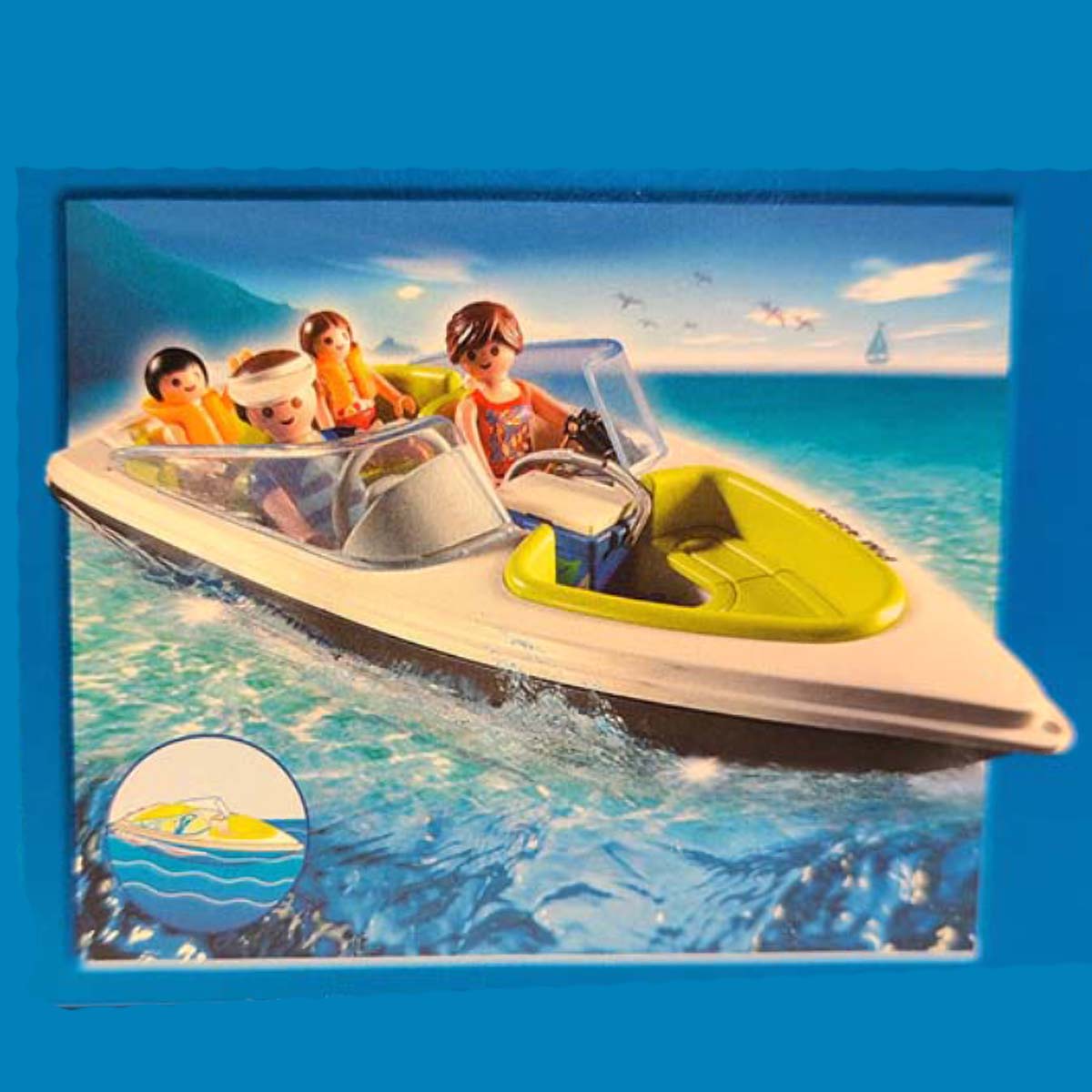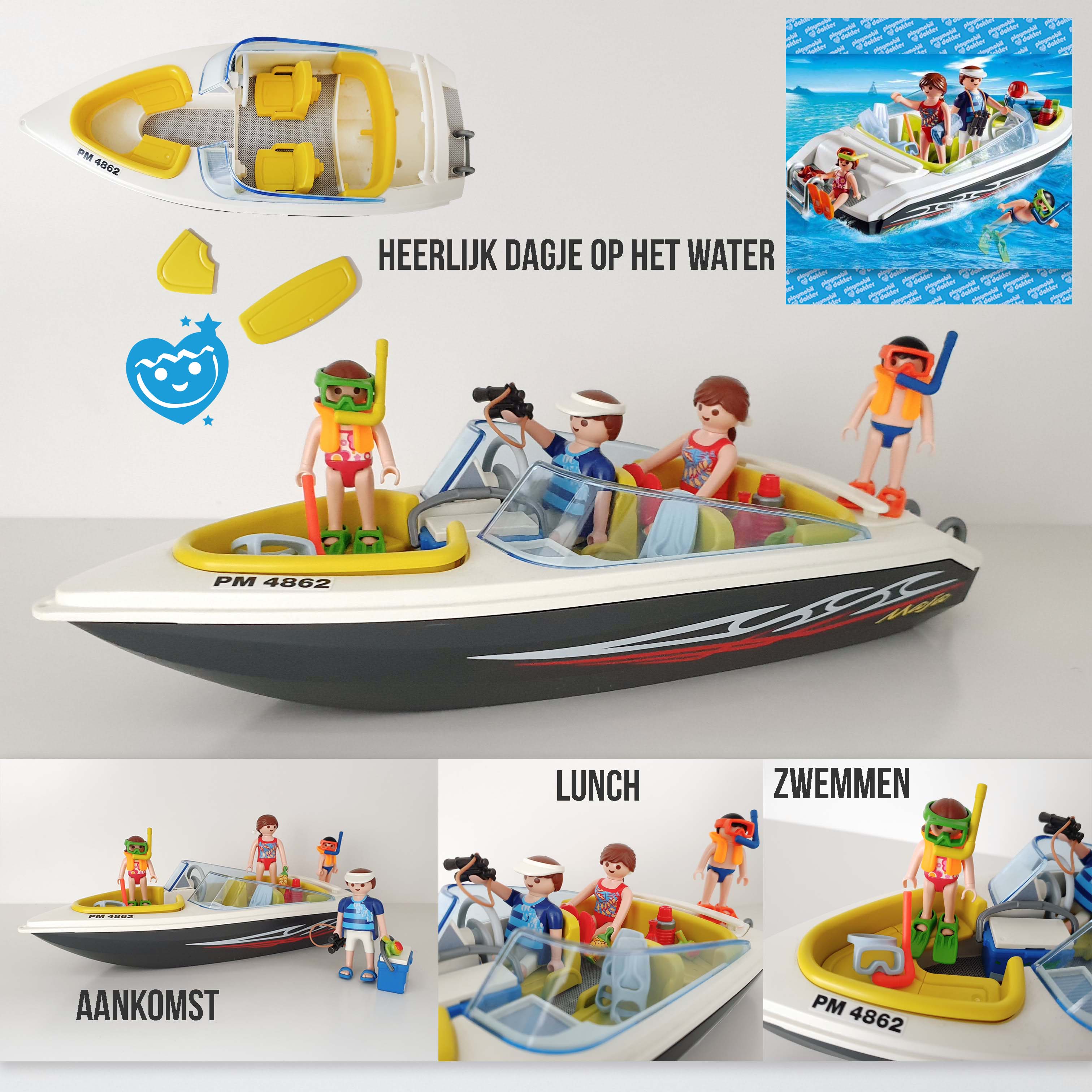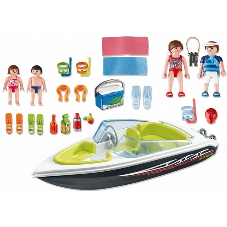 Neem de hele familie mee in deze snelle Playmobil speedboot. Voorzien van laadruimte en vele leuke accessoires zoals snorkeluitrusting, vader-, moederfiguur en 2 kinderfiguren, strandlakens etc. De Playmobil boot drijft en kan uitgerust worden met de Playmobil onderwatermotor (art. 7350).