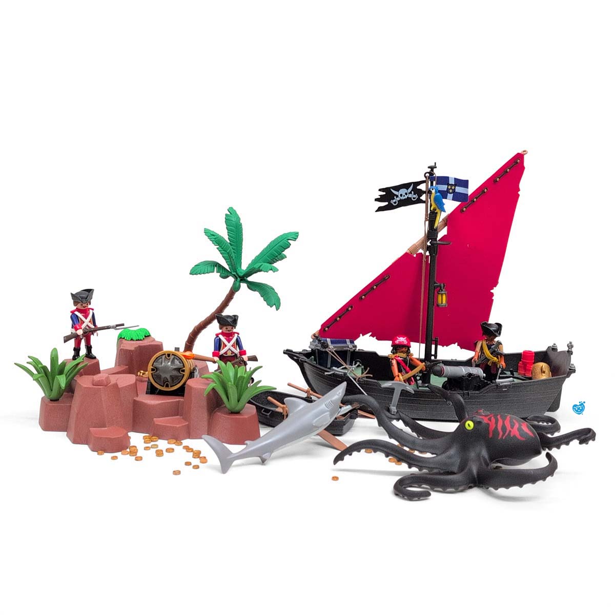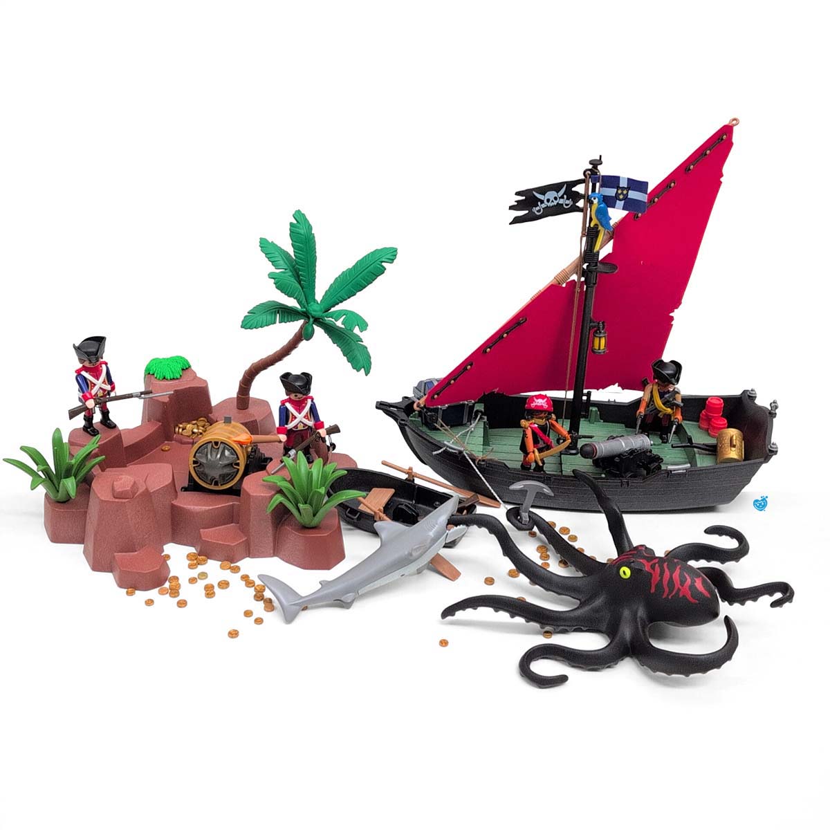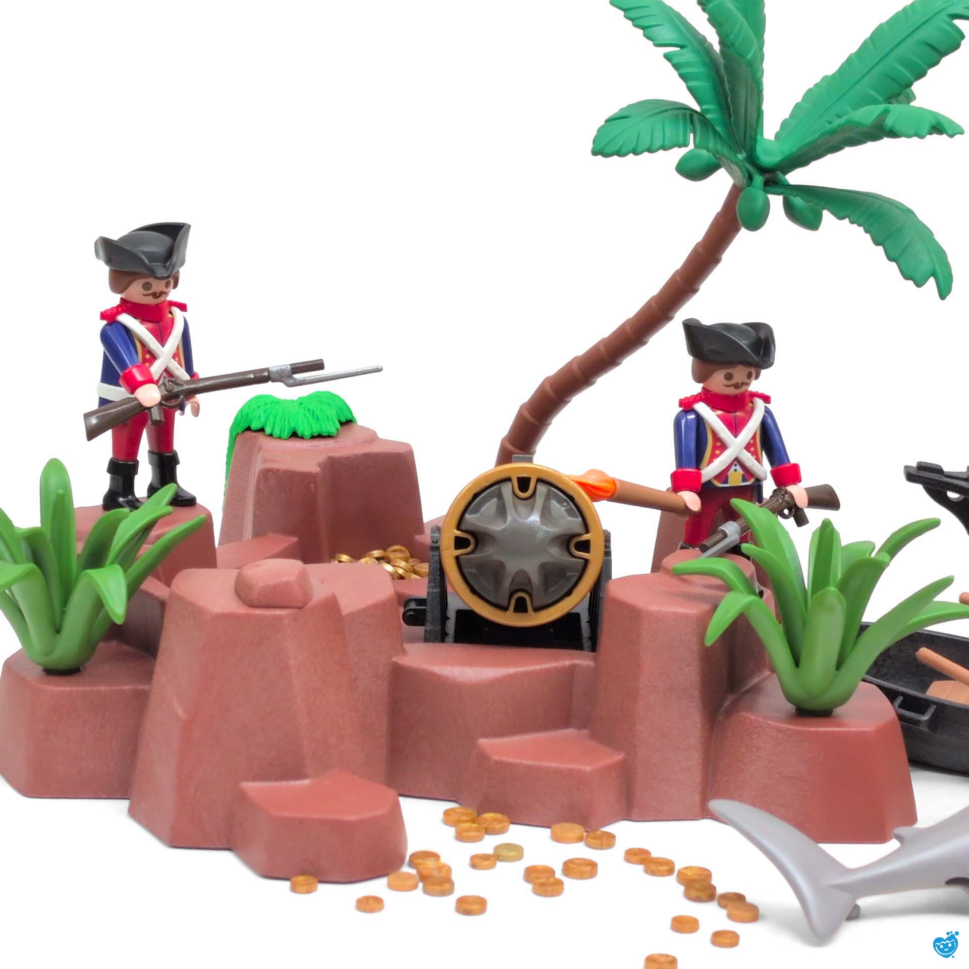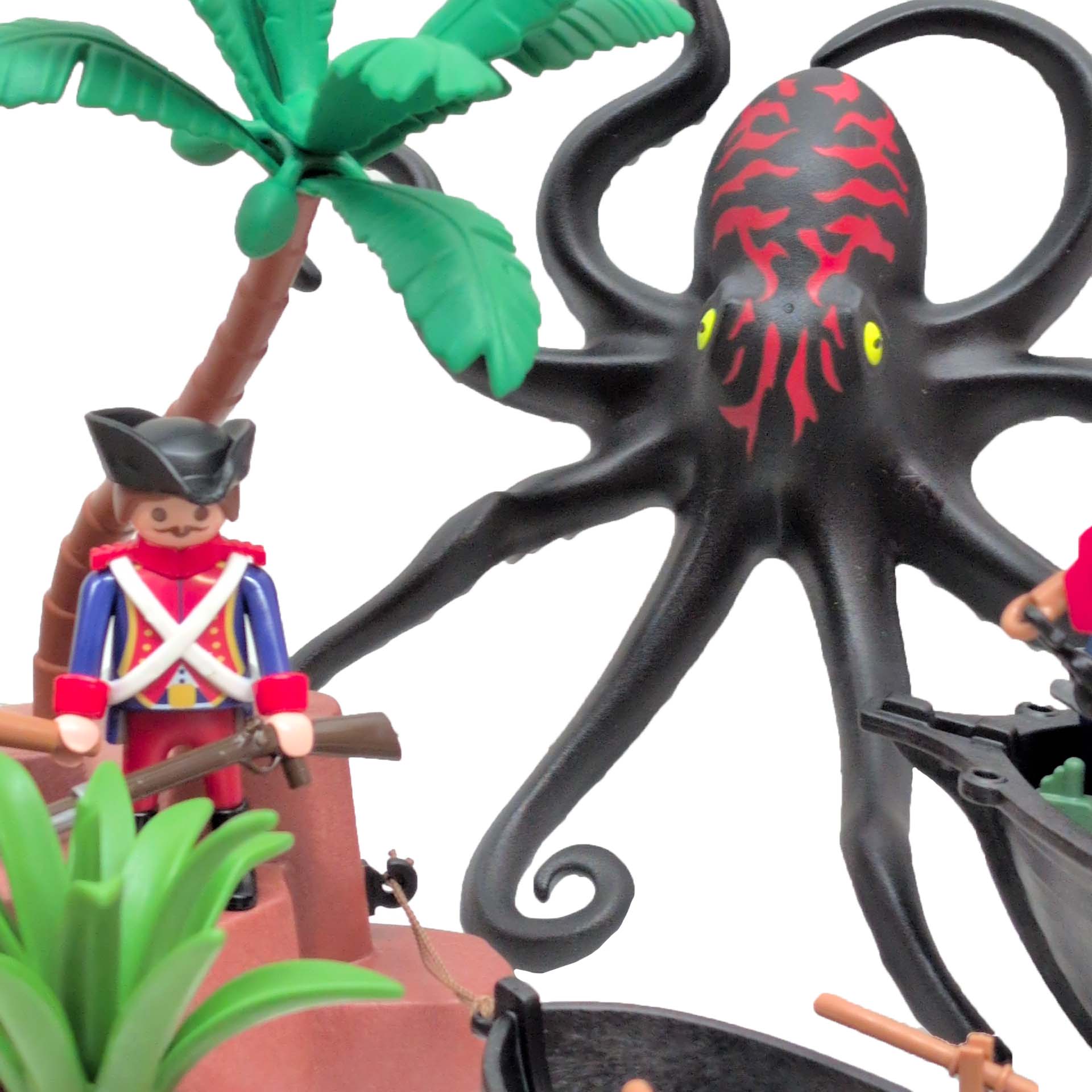 Een dappere strijd tussen piraten en soldaten op een tropisch eiland vol geheimen. Terwijl de piraten hun buit verdedigen aan boord van hun zwarte schip met rood zeil, proberen de soldaten het goud te veroveren. De reuzeninktvis en haai maken het water gevaarlijker dan ooit! Inclusief boot, eiland met palmboom, vijf figuren, schatkist, wapens en tal van accessoires.