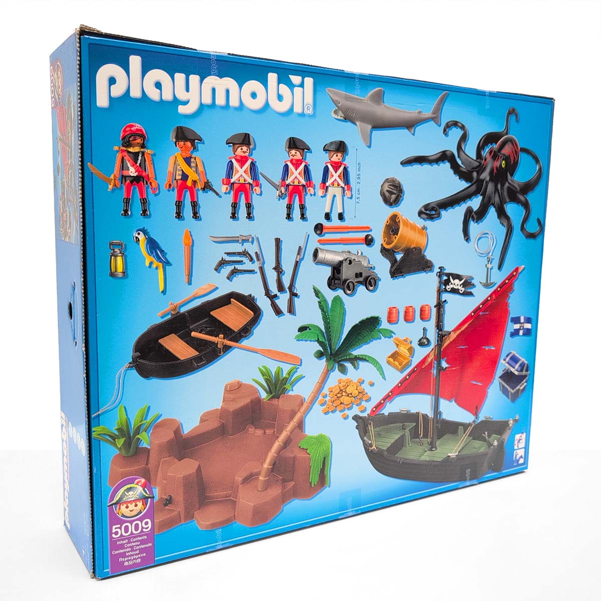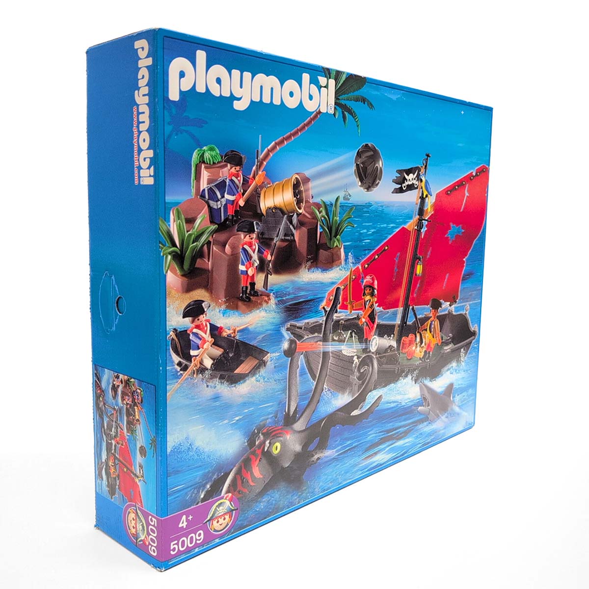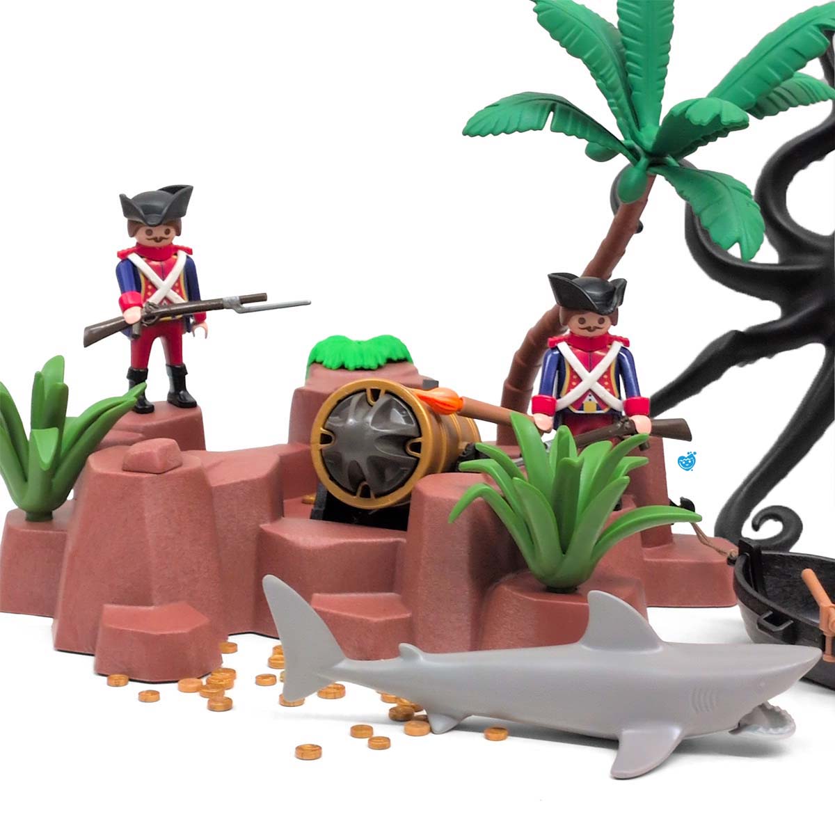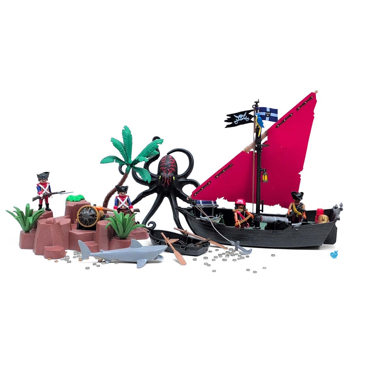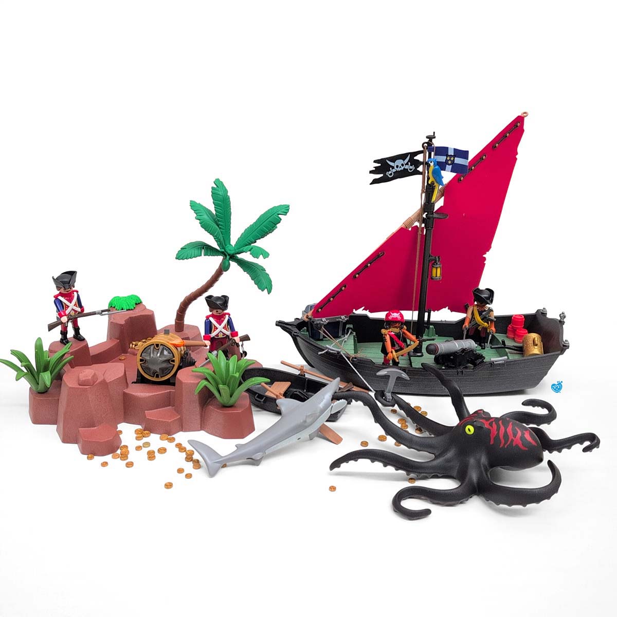 Een dappere strijd tussen piraten en soldaten op een tropisch eiland vol geheimen. Terwijl de piraten hun buit verdedigen aan boord van hun zwarte schip met rood zeil, proberen de soldaten het goud te veroveren. De reuzeninktvis en haai maken het water gevaarlijker dan ooit! Inclusief boot, eiland met palmboom, vijf figuren, schatkist, wapens en tal van accessoires.