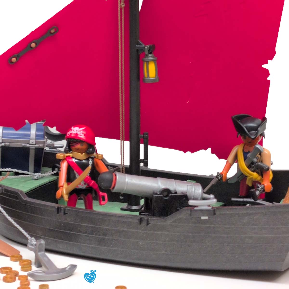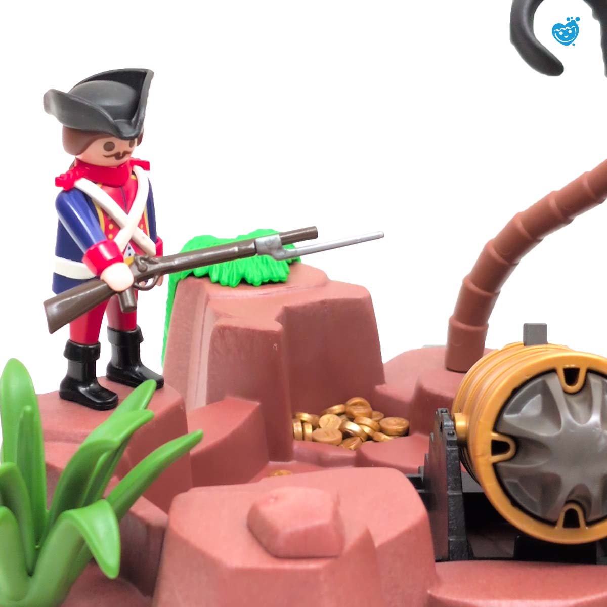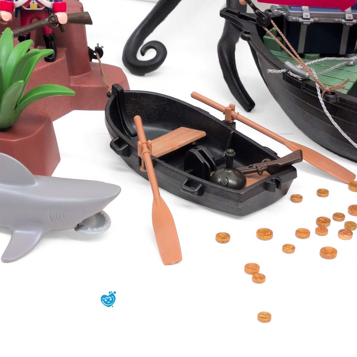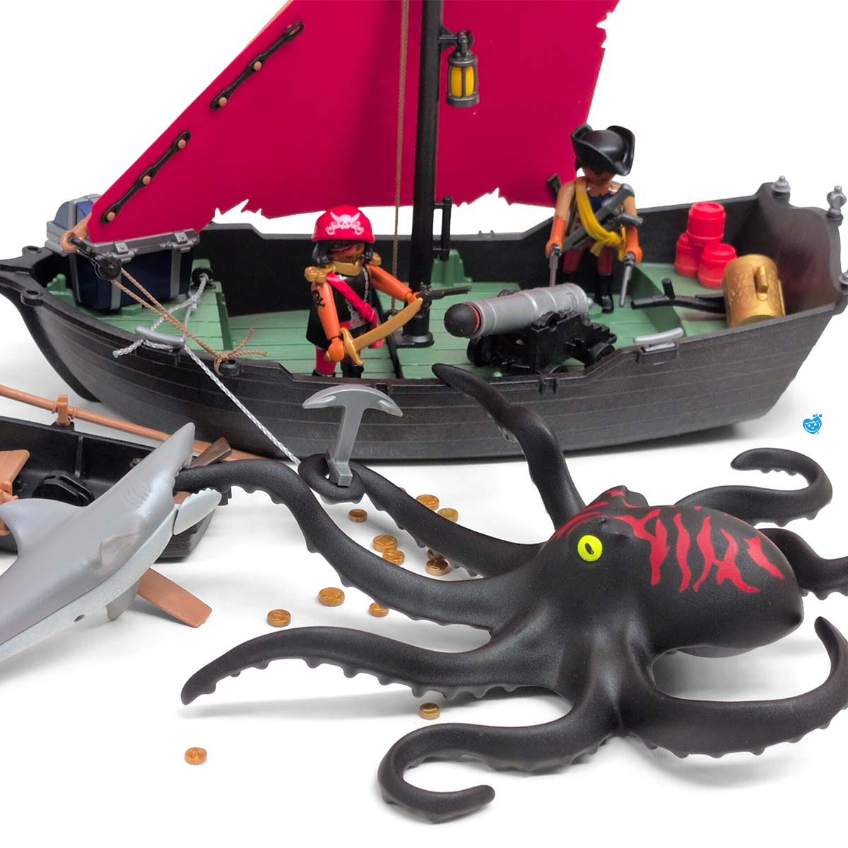 Een dappere strijd tussen piraten en soldaten op een tropisch eiland vol geheimen. Terwijl de piraten hun buit verdedigen aan boord van hun zwarte schip met rood zeil, proberen de soldaten het goud te veroveren. De reuzeninktvis en haai maken het water gevaarlijker dan ooit! Inclusief boot, eiland met palmboom, vijf figuren, schatkist, wapens en tal van accessoires.