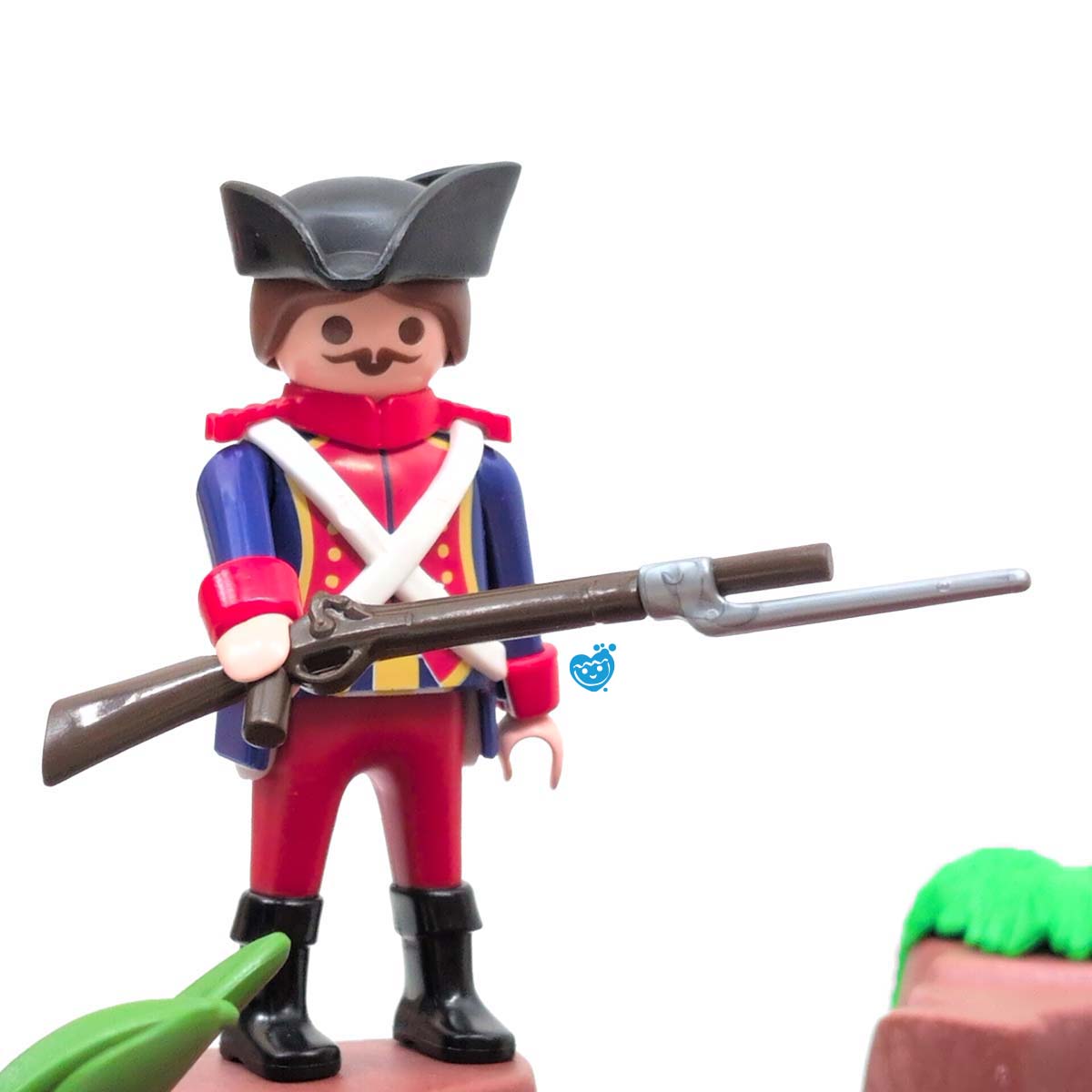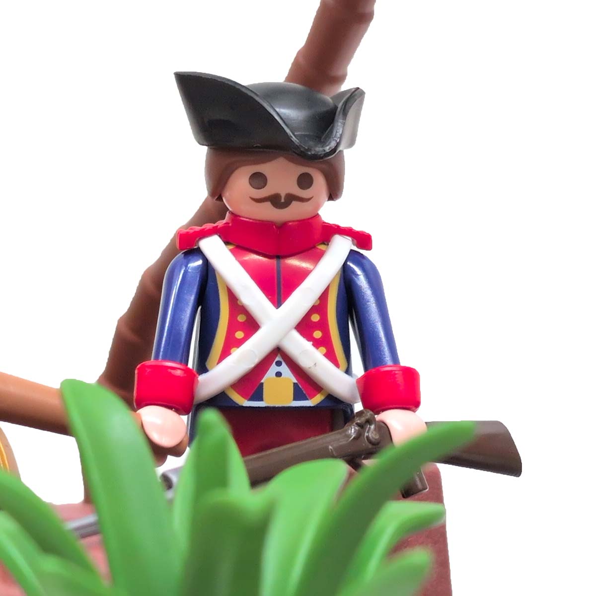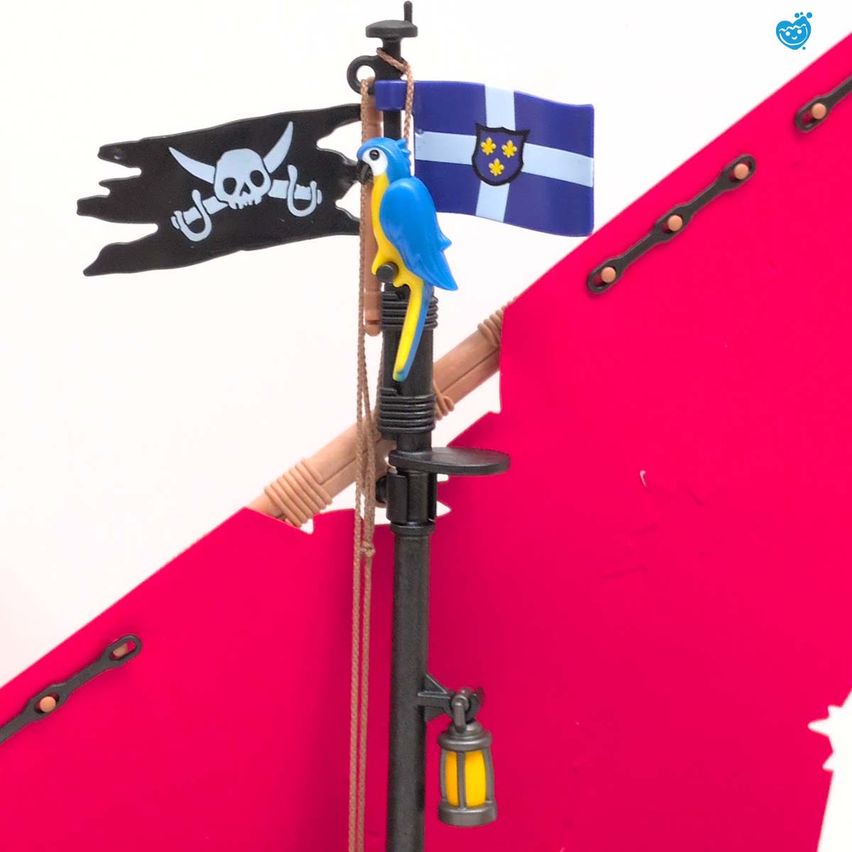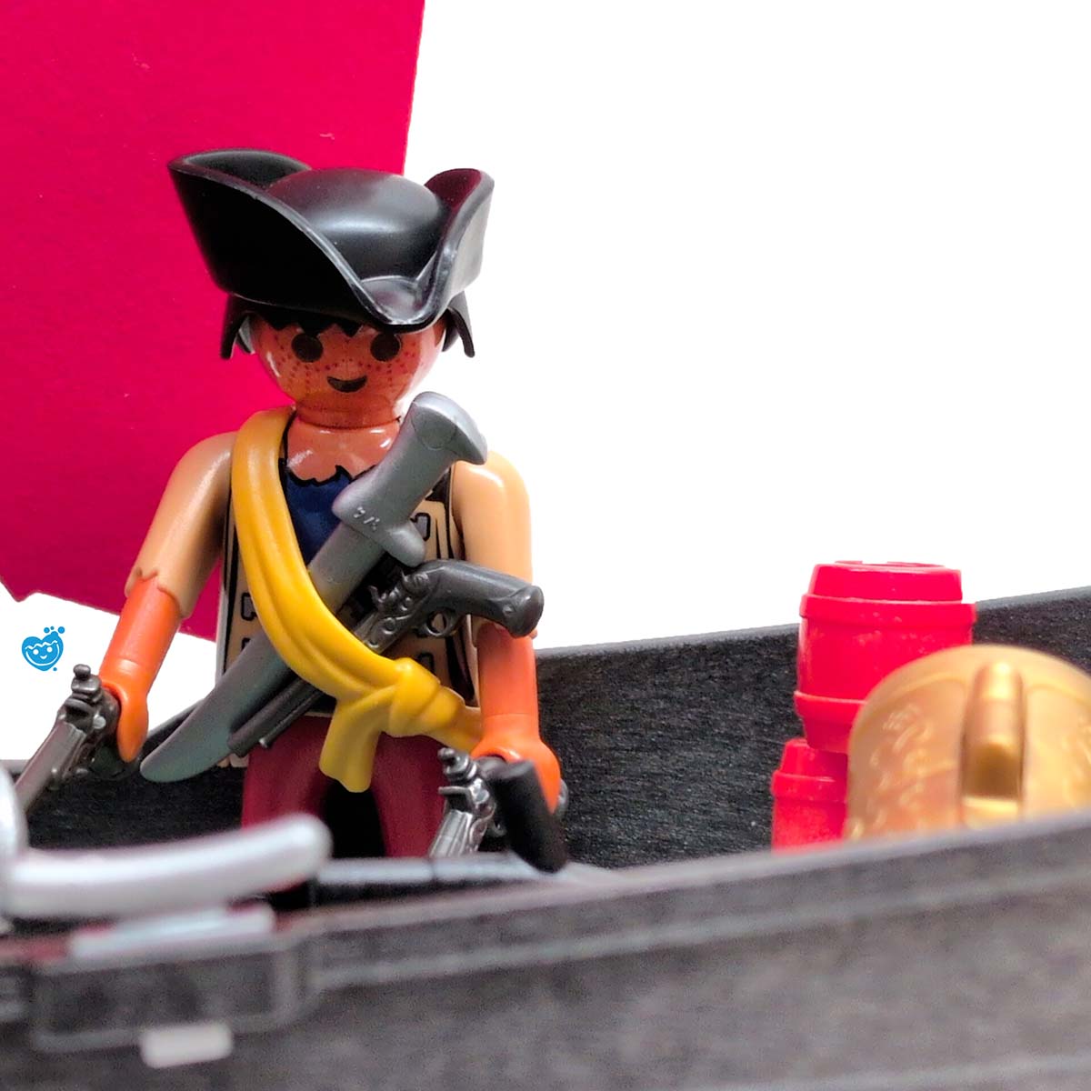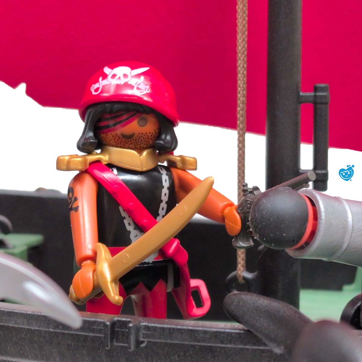 Een dappere strijd tussen piraten en soldaten op een tropisch eiland vol geheimen. Terwijl de piraten hun buit verdedigen aan boord van hun zwarte schip met rood zeil, proberen de soldaten het goud te veroveren. De reuzeninktvis en haai maken het water gevaarlijker dan ooit! Inclusief boot, eiland met palmboom, vijf figuren, schatkist, wapens en tal van accessoires.