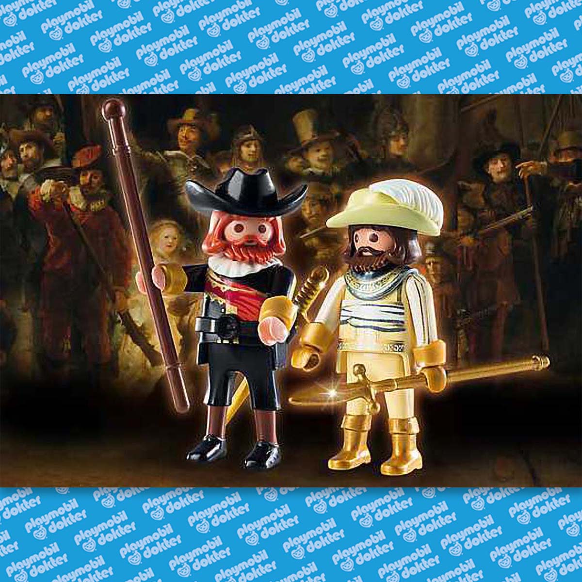 De Nachtwacht, bijnaam van het schuttersstuk De compagnie van Amsterdam, is het bekendste schilderij en meesterwerk van Rembrandt van Rijn. Rembrandt schilderde het doek tussen 1639 en 1642. Playmobil heeft, om de heropening van het Rijksmuseum te vieren, dit Playmobil setje van De Nachtwacht uitgebracht. Het setje bevat de Playmobil figuren kapitein Frans Banning Cocq en luitenant Willem van Ruytenburgh, een wandelstok, een zwaard en een partisan speer.