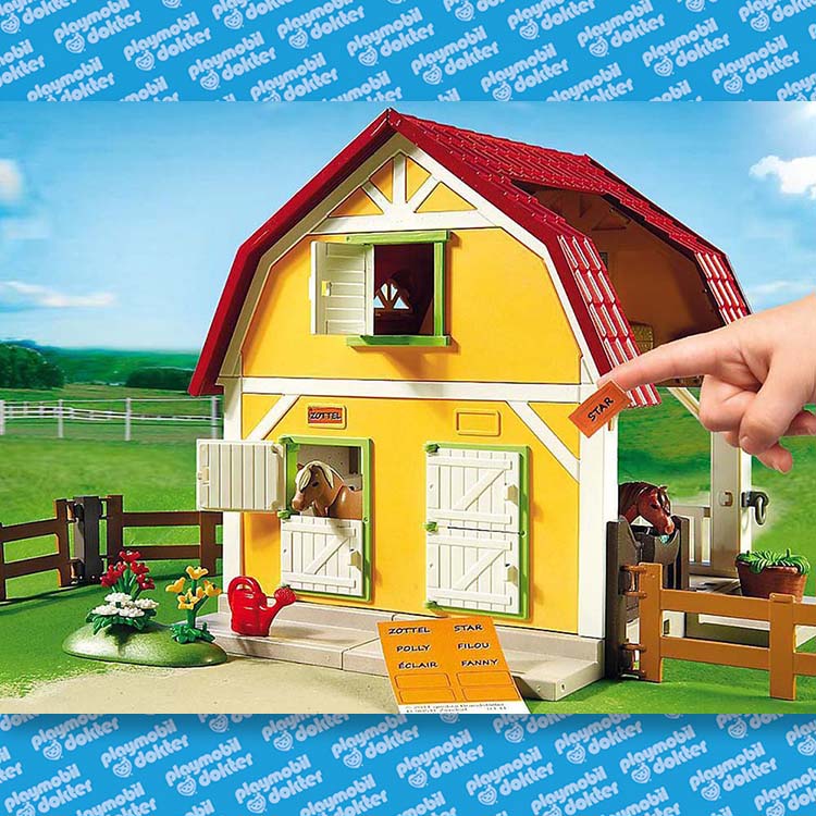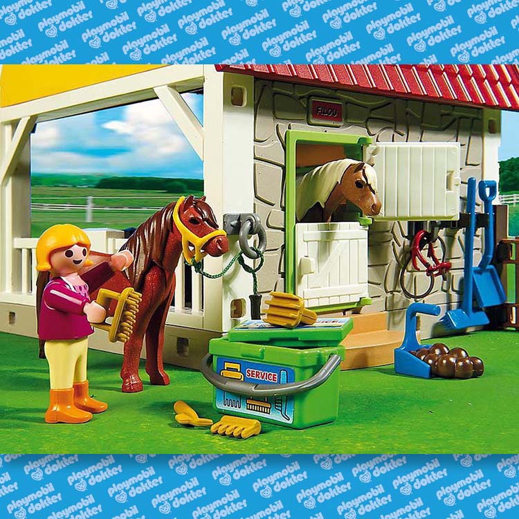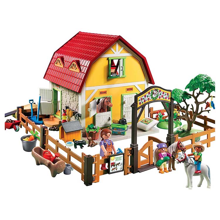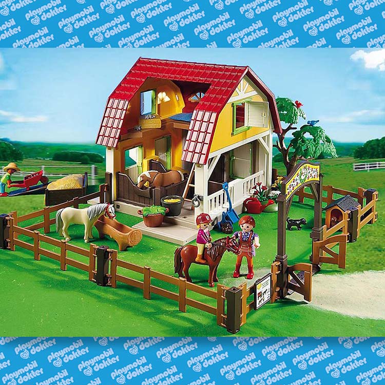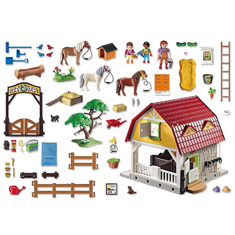 Op de ponyranch van Playmobil is het een drukte van jewelste. Er is ruimte voor 3 paarden in de boxen en er is ook nog een hooizolder. Met veel leuke accessoires, zoals borstels voor het paard, een kruiwagen, gieter en een olielamp. Inclusief 3 Playmobil speelfiguren.