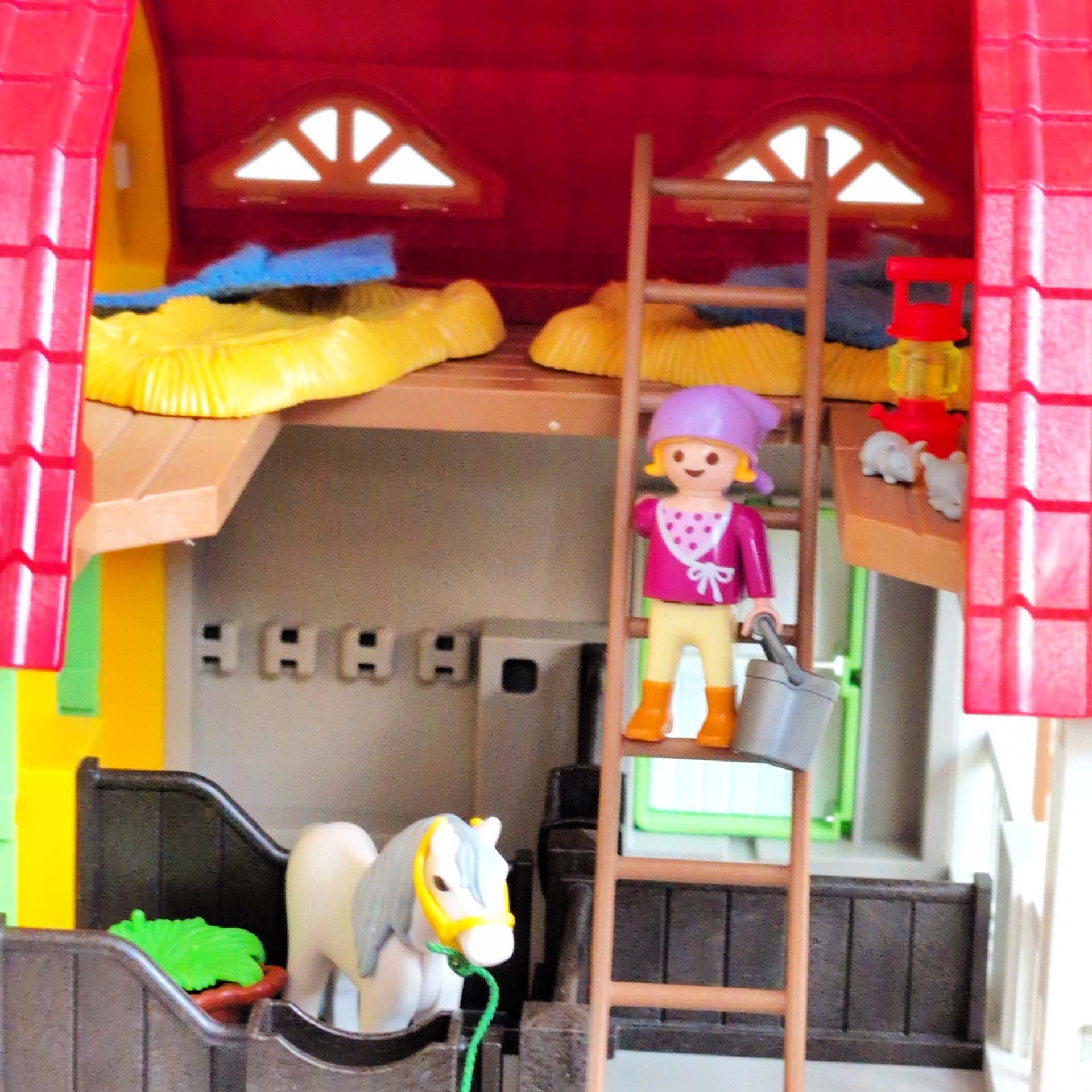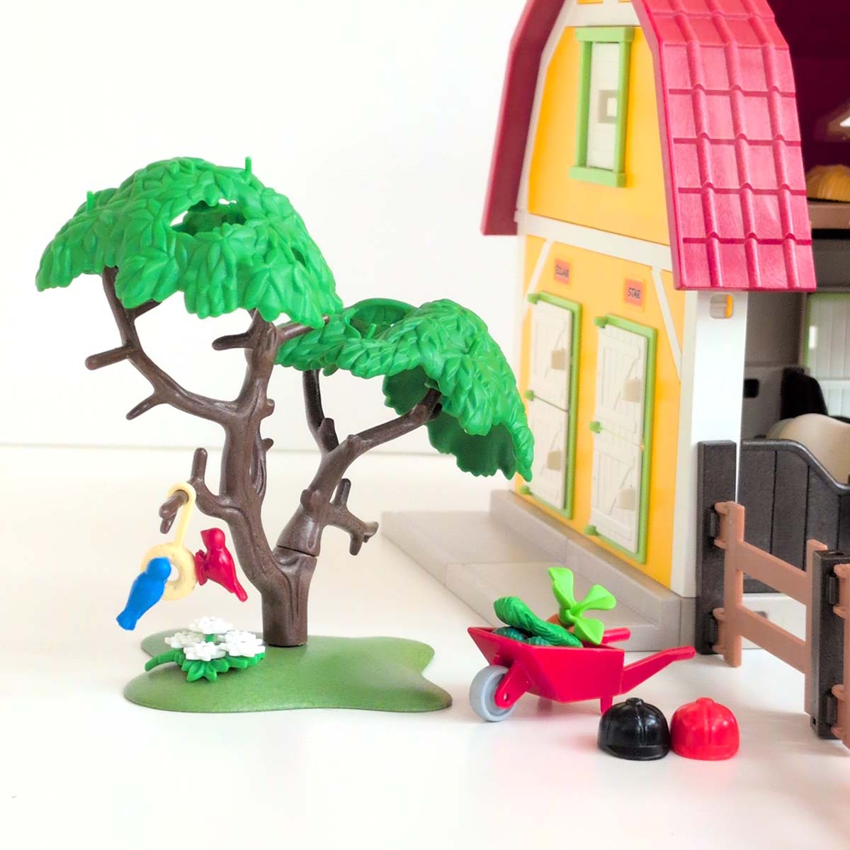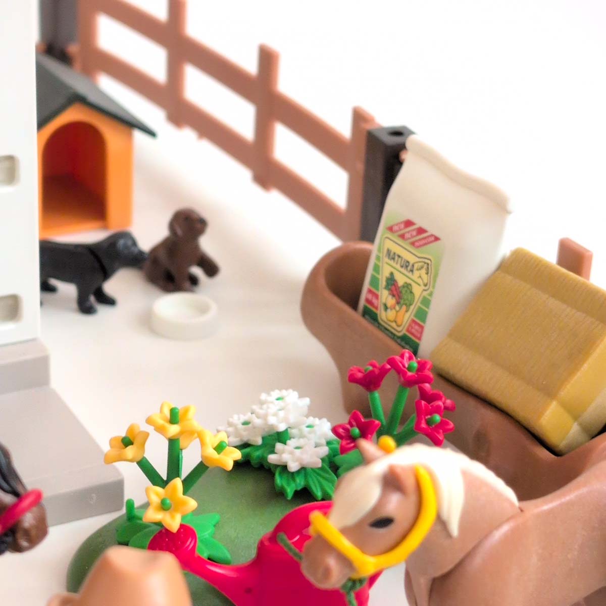 Op de ponyranch van Playmobil is het een drukte van jewelste. Er is ruimte voor 3 paarden in de boxen en er is ook nog een hooizolder. Met veel leuke accessoires, zoals borstels voor het paard, een kruiwagen, gieter en een olielamp. Inclusief 3 Playmobil speelfiguren.