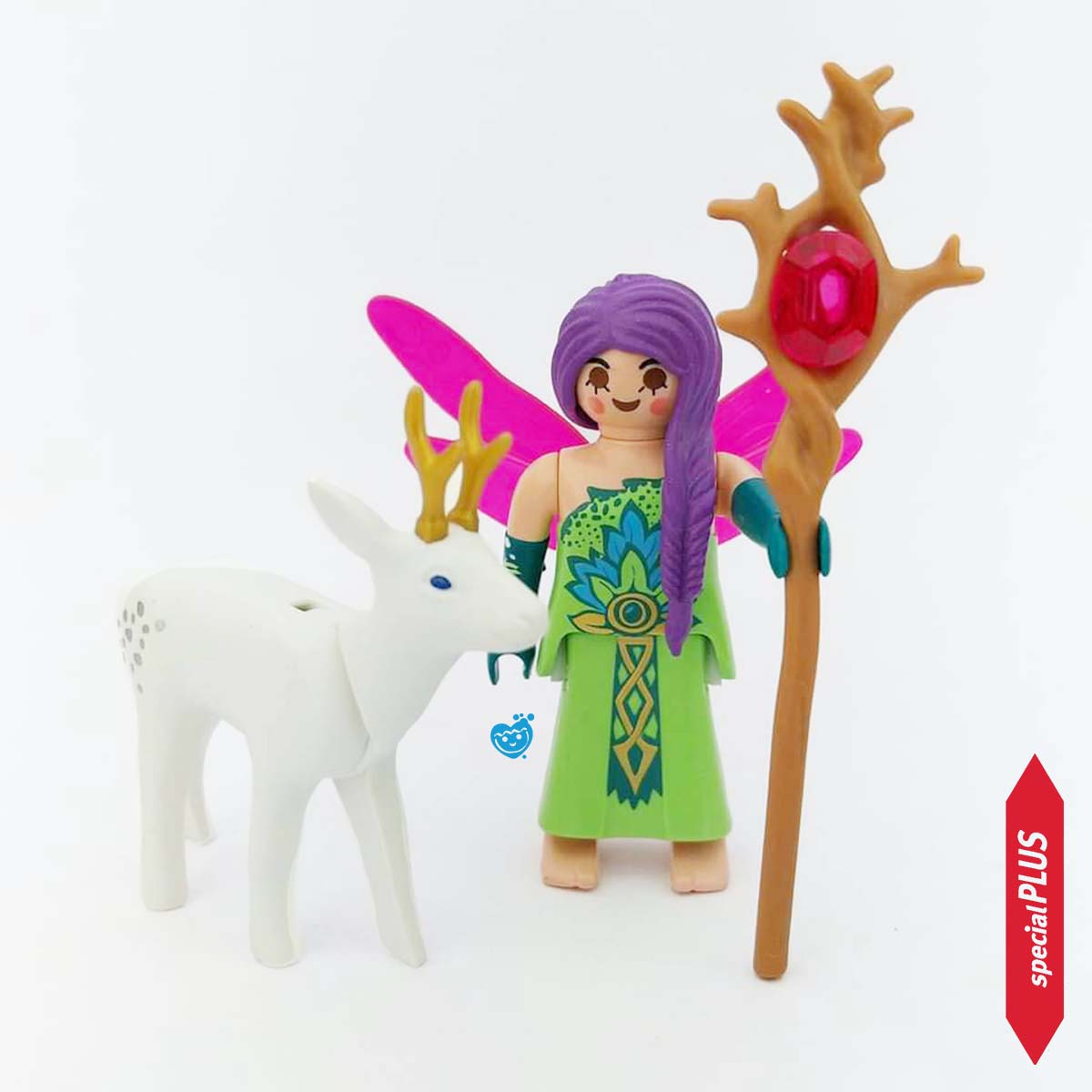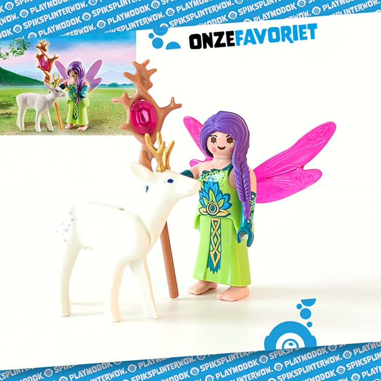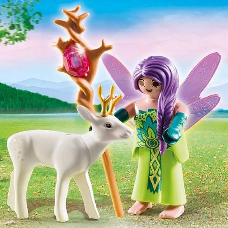 Deze Magische Playmobil 5370 fee is een bijzonder personage in het Playmobil thema Sprookjesland. De fee komt met haar magische rendier op een open plek. De fee draagt een groene jurk en heeft een staf met een gele edelsteen.
