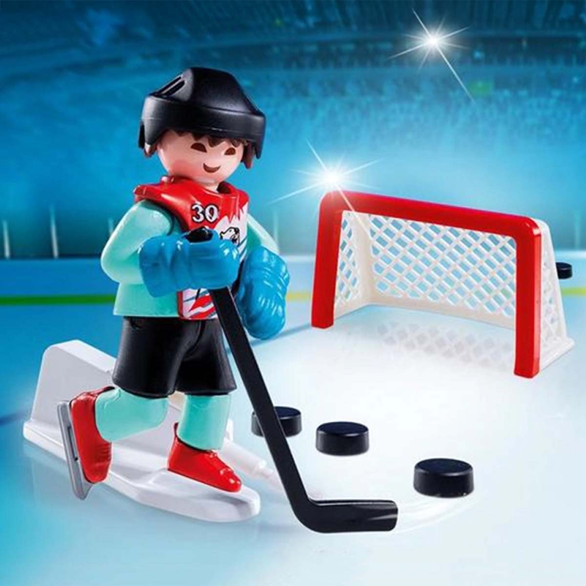 Het toernooi begint! De Playmobil ijshockeyspeler staat klaar. Met zijn schaatsen schuift hij over de schaatsbaan, richting de puck. Hij pakt de puck af van de tegenstander en gaat op het doel af. Hij kijkt nog even naar het doel en slaat dan met zijn stick hard tegen de puck. Hij ziet de puck richting het doel vliegen en… Goal! Dit setje bevat een schietmechanisme waarmee je de puck kunt wegschieten.
