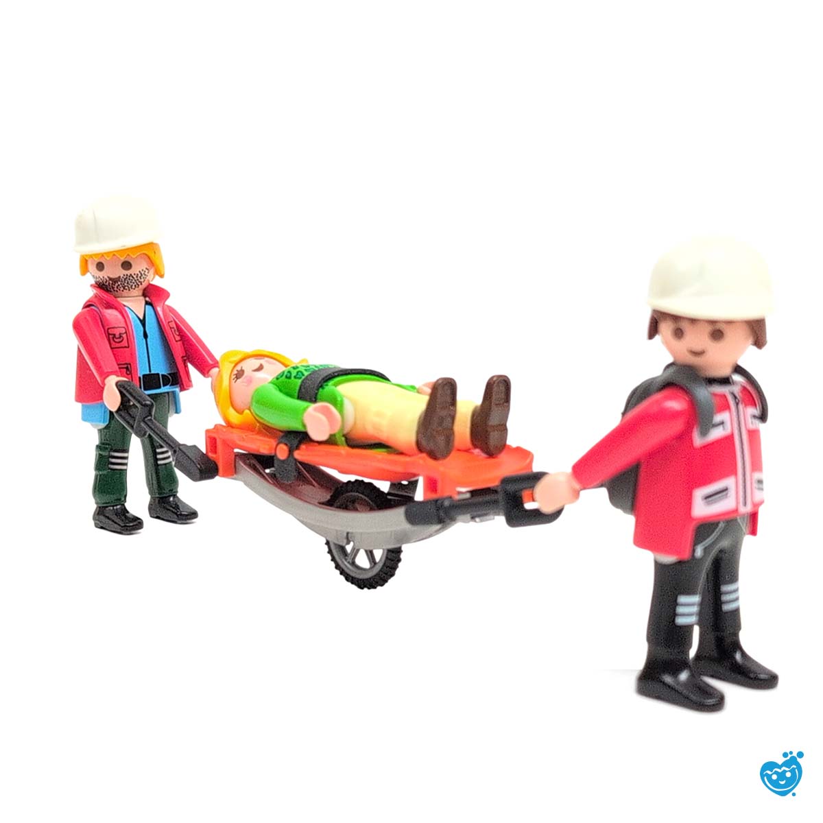 De gewonde Playmobil bergbeklimster wordt met de brancard veilig van de berg getransporteerd. Inclusief 2 reddingswerkers met helm en rugzak.
