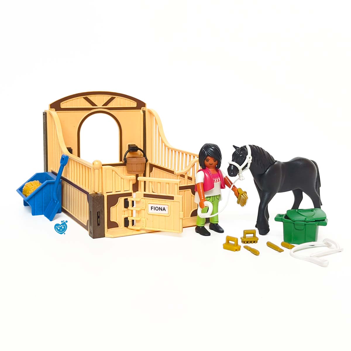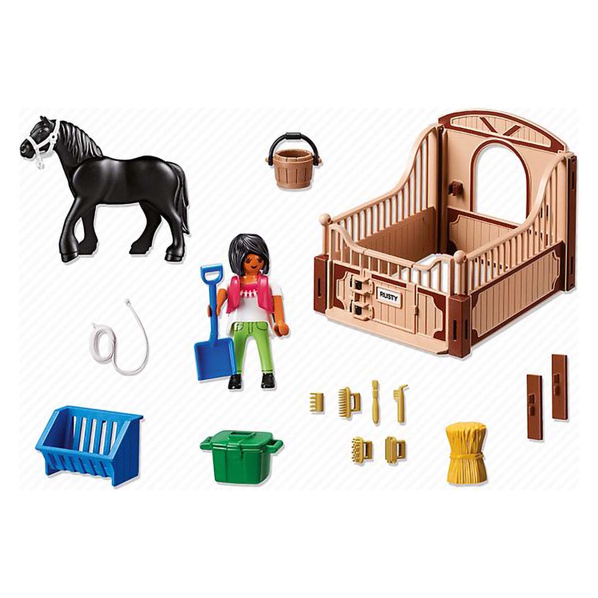 De berijdster is druk bezig met schoonmaken in de Playmobil paardenbox. Haar prachtige paard Rusty heeft ze even buiten in de wei gezet terwijl het nichtje van Rusty even in de box lekker wat kan eten en goed verzorgd wordt. Inclusief mestschep, voederbak met hooi, emmer en bak met kammen en borstels.
