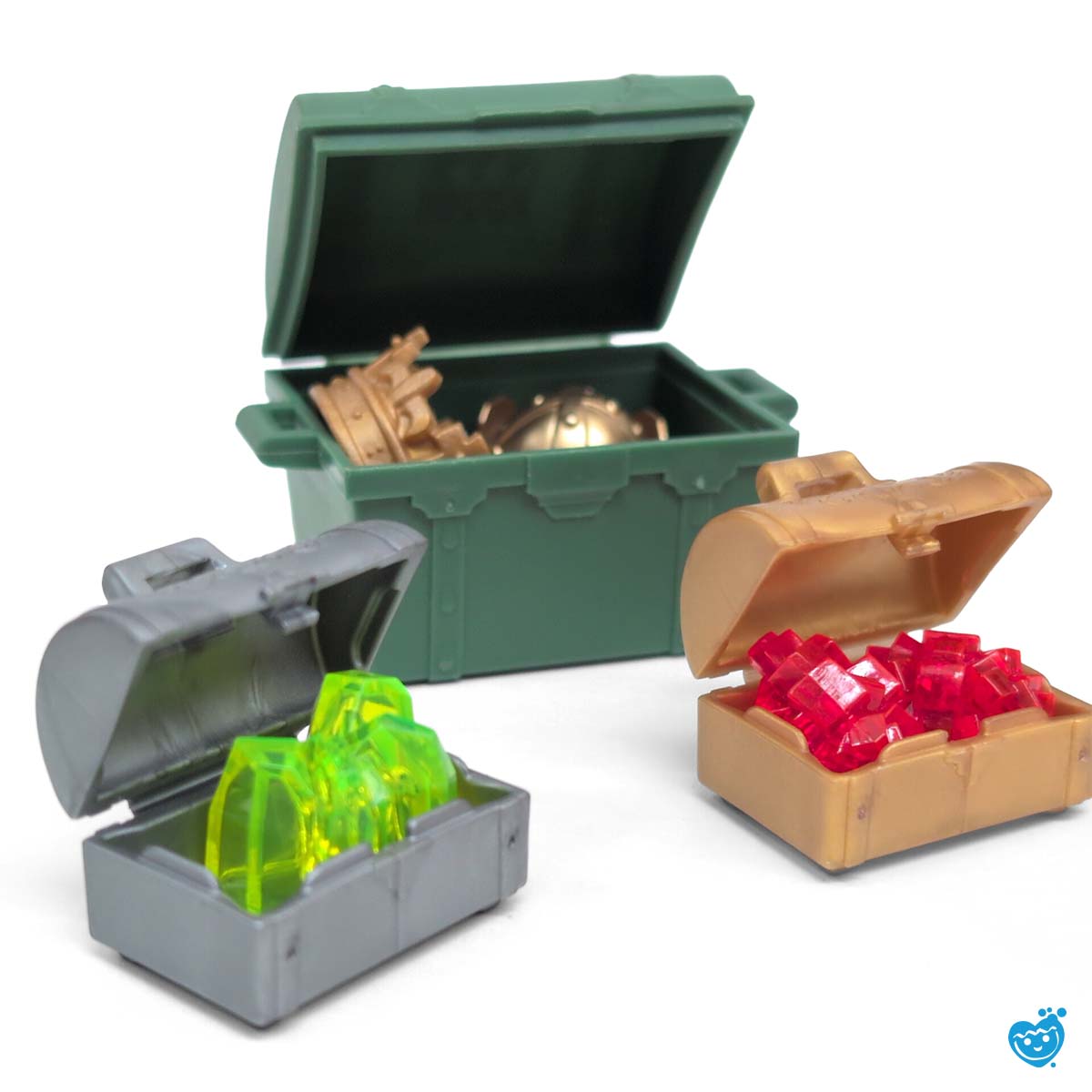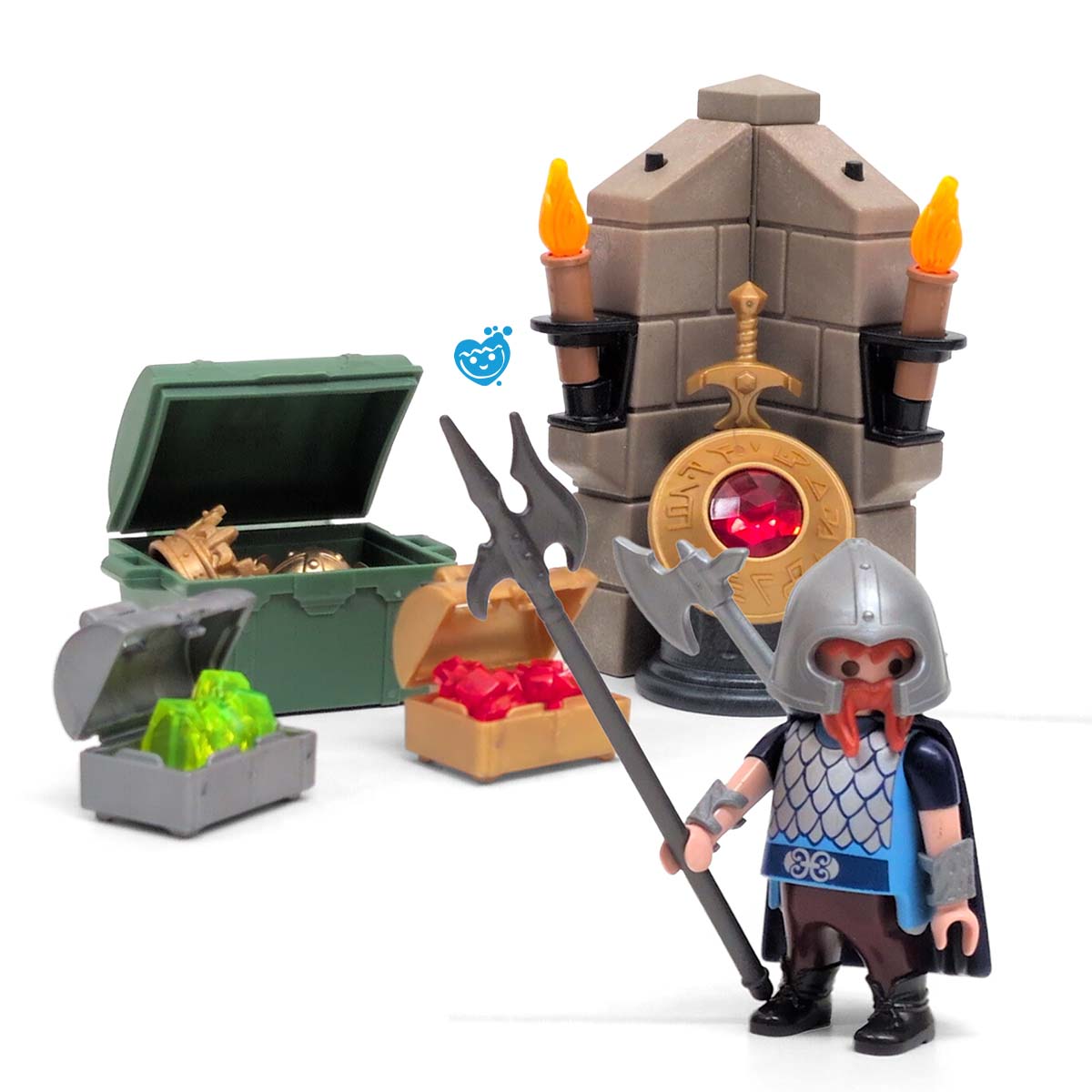 Playmobil 6160 Bewaker van de koningsschat. Deze Playmobil bewaker neemt zijn taak zeer ernstig en bewaakt de koningsschat met zijn leven. De schat bestaat uit 3 schatkisten vol met goudklompen, gouden en zilveren munten, een kroon en diverse edelstenen. Verder bevat de set diverse ridderwapens en 2 echt lichtgevende fakkels.