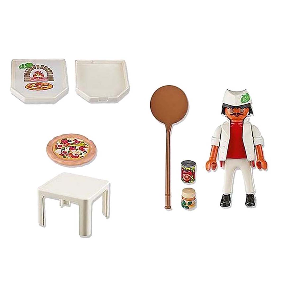 De allerlekkerste Playmobil pizza’s worden natuurlijk gebakken door de echte Playmobil pizzabakker. De pizza gaat warm de doos in om thuis bezorgd te worden. Inclusief 1 Playmobil speelfiguur, 2 blikjes, pizza, pizzadoos, pizzaschep en tafeltje.