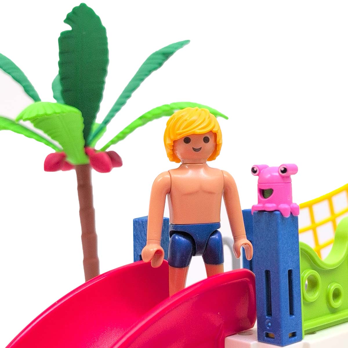 Deze leuke set van het Playmobil 6670 waterpretpark thema zorgt voor veel waterplezier. Wie glijdt er als eerste van de glijbaan? Let wel op dat het licht van de kleine octopus op groen staat. Daarna nemen we een verfrissend douche onder de echt werkende waterpomp. De waterwip is ideaal om mee te experimenteren. Eerst verzamelt het water zich in de emmer van de wip. Eenmaal vol, gaat het speelfiguurtje op de wip naar boven. Het water loopt er vanzelf weer uit. Het rooster onder de douche vangt het water terug op, zodat er geen water wordt verspild. Inclusief 2 Playmobil figuren in badkleding en een palmboom.