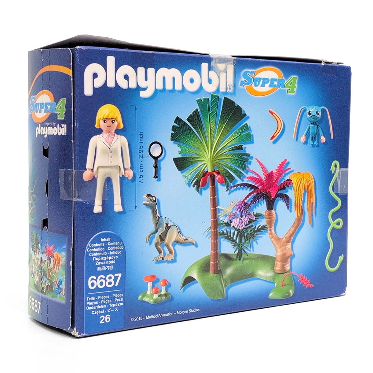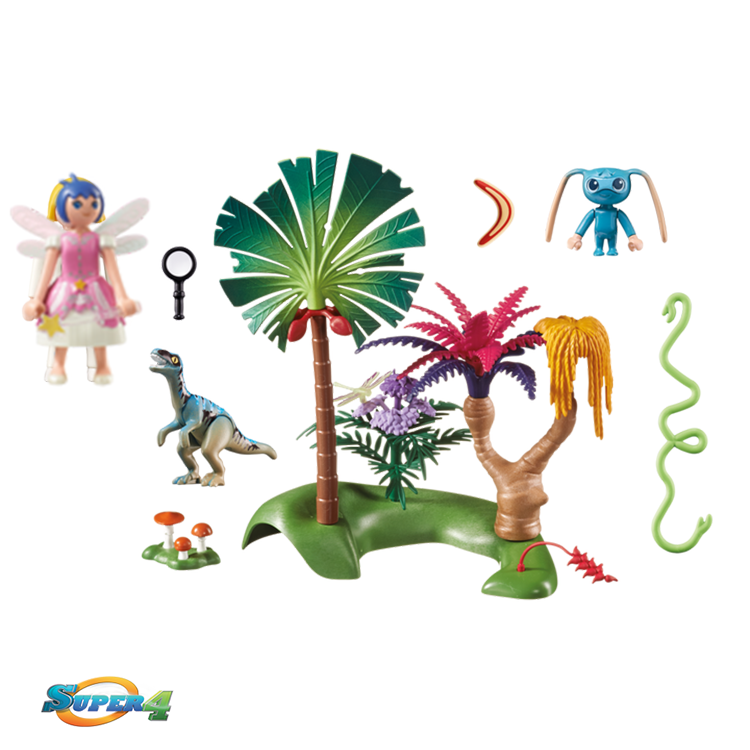 Deze Playmobil Super 4 figuur alien is gewapend met een boemerang. De fee/wetenschapper uit Technopolis doet onderzoek naar de fauna en flora van Lost Island. Hij vlucht weg tussen de palmbomen na een aanval van de velociraptor dinosaurus. De Super 4 figuur alien snelt ter hulp door middel van zijn boemerang. Inclusief alien, 1 velociraptor en een libelle, EXclusief het orginele speelfiguur hier ben ik nog naar op zoek, nu heb ik de fee met het roze jurkje van Super 4 toevegoegd aan de set past ook echt heel goed 🙂