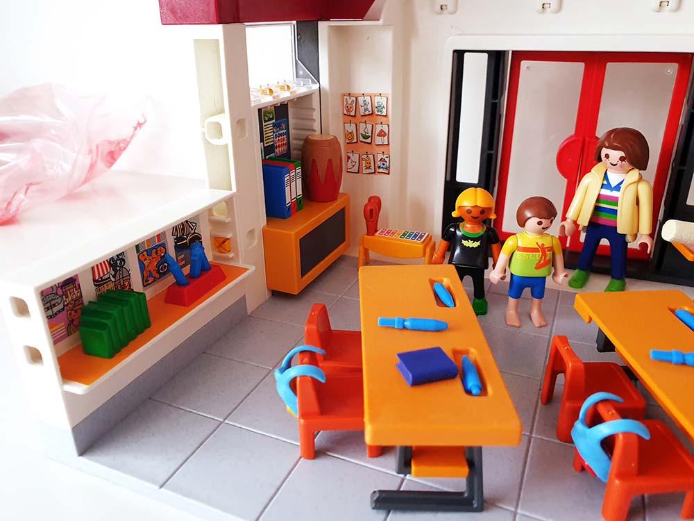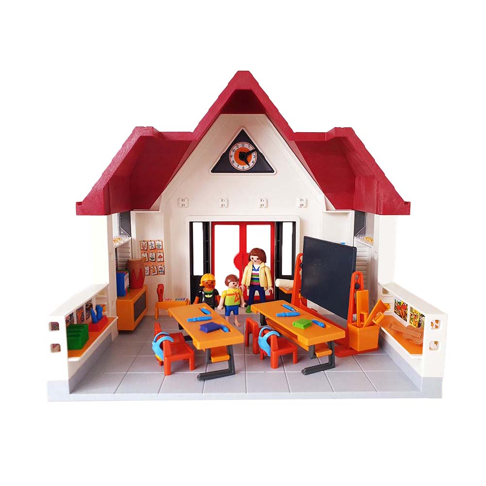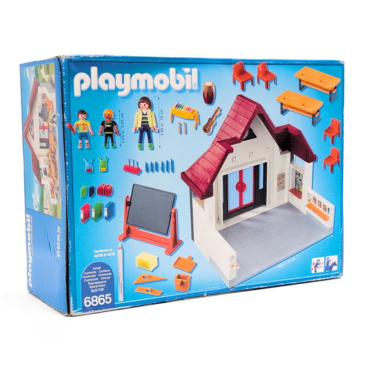 Dit is de Playmobil school om mee te nemen. De wijzers van de klok staan exact op half 9! Triiiing! De schoolbel gaat. De kinderen lopen door de deur het klaslokaal binnen. De juf pakt haar krijtje en begint op het bord te schrijven. Vandaag gaan we wat rekensommen maken en daarna mogen we knutselen en tekenen. Na de les veegt de juf haar bord af met de spons. Goed gedaan, kinderen! Nu is het tijd om te knutselen en te tekenen. De kinderen maken veel plezier en voor ze het weten, is de school al weer uit. Tijd om naar huis te gaan. De school gaat sluiten… Inclusief 3 Playmobil speelfiguren.