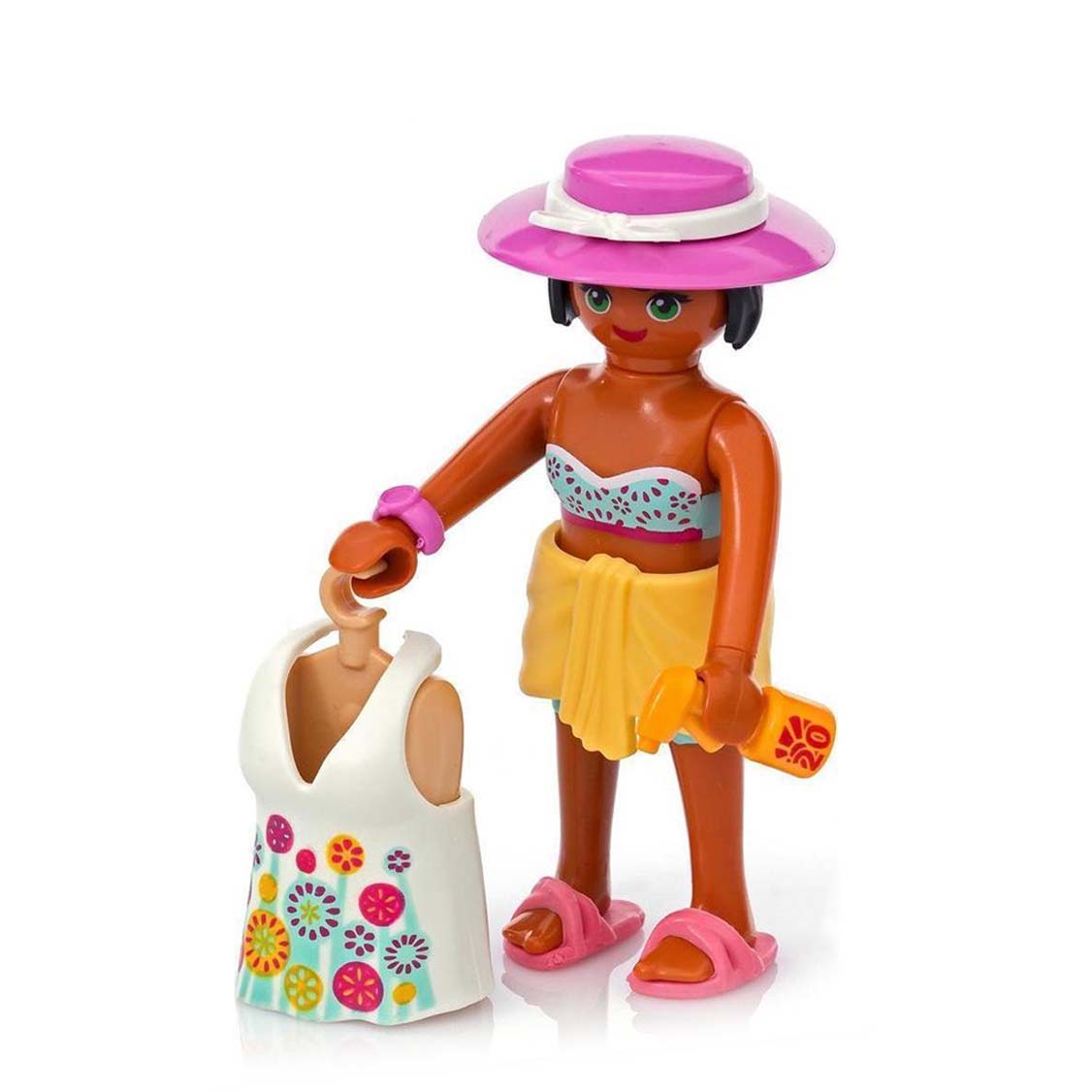 De bijhorende kledingstukken kunnen met de meegeleverde kleerhanger opgehangen worden in de kledingrekken van de shop. Inclusief 1 Playmobil speelfiguur met hoed, horloge en zonnebrand.