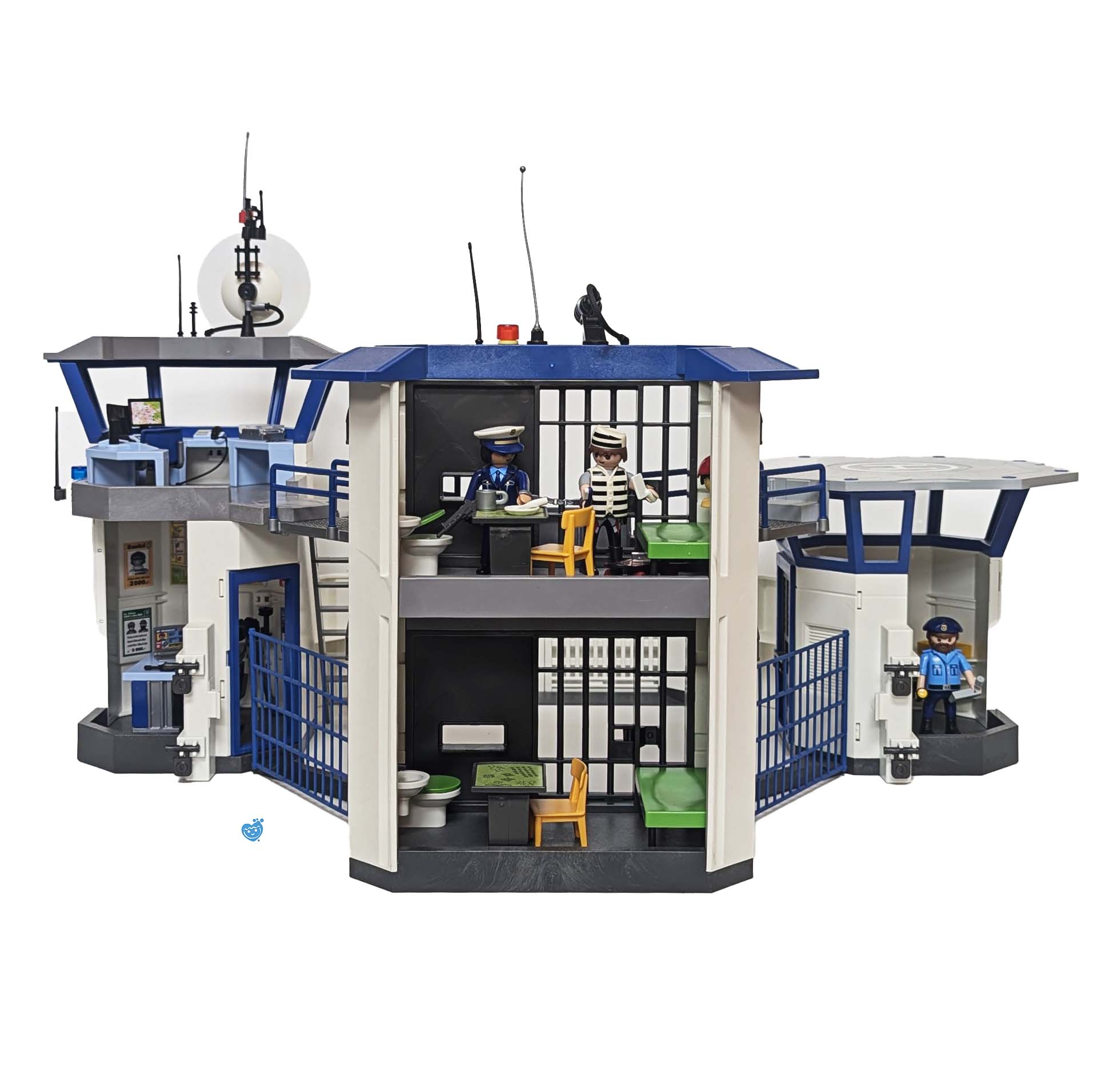 Alarm! De boef is ontsnapt uit de cel! Gelukkig zijn er voldoende agenten in de buurt om hem snel weer bij de kraag te grijpen. Met 3 figuren en accessoires. Met twee gevangeniscellen, een registratieruimte voor vingerafdrukken en foto’s, een uitkijkpost, een kabinet met voorraadwapens en nog veel meer leuke accessoires. De gevange kan ontsnappen uit de gevangenis via de uitneembare muur. Een gevange en 2 politieagenten. Afmetingen: 63x45x26cm. Opbouwtijd: Ca. 90 minuten