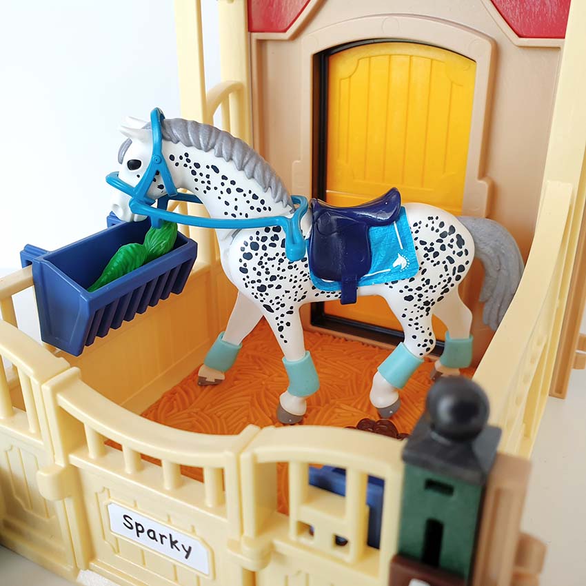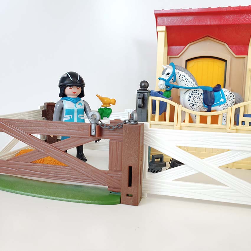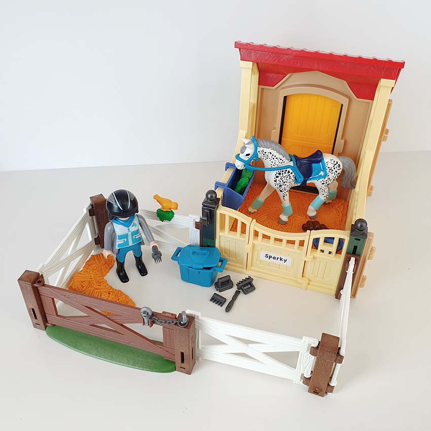 Deze Playmobil paardenbox “Appaloosa” biedt extra plaats voor een paard en kan aan de Playmobil Paardrijclub (art. 6926) worden gekoppeld. Er is een deur naar de aangrenzende paddock. Kleurrijke blikvanger: Amazone en paard zijn qua kleur op elkaar afgestemd. Inclusief 1 Playmobil speelfiguur en 1 Playmobil paard.