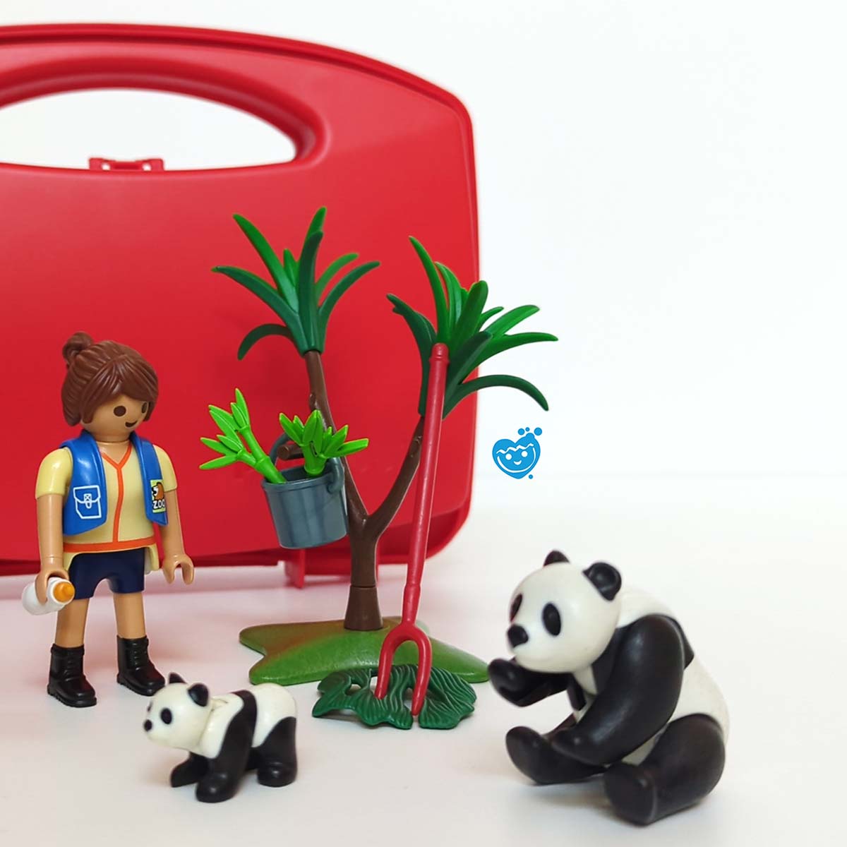 Deze meeneem dierenset van Playmobil kan overal mee naartoe genomen worden. Bevat een dierenverzorgster, een volwassen en baby panda en mooie accessoires zoals bamboe stengels, boompje, melkfles, emmer en een riek. Dit alles zit in een handig rood koffertje.