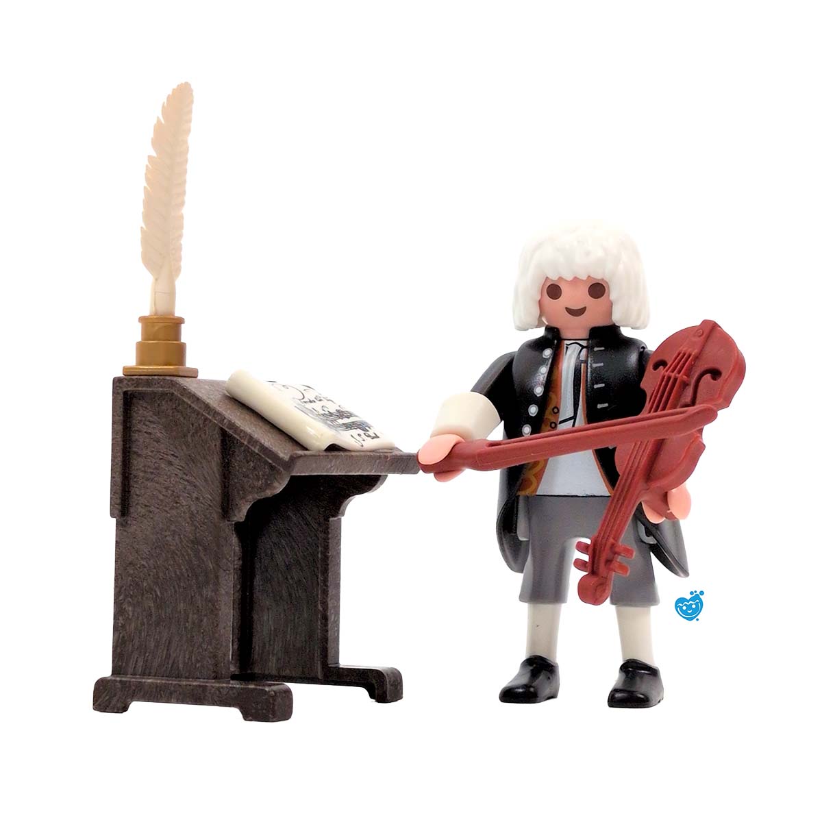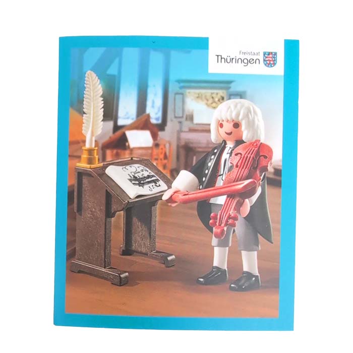 Johann Sebastian Bach. Dit unieke setje van Playmobil bevat de historische figuur Johann Sebastian Bach (Eisenach, 21 maart 1685 ? Leipzig, 28 juli 1750). Bach was een Duitse componist van barokmuziek, organist, klavecinist, violist, muziekpedagoog en dirigent. Hij wordt door de meeste muziekwetenschappers beschouwd als een van de grootste en invloedrijkste componisten uit de geschiedenis van de klassieke muziek vanwege de inventiviteit waarmee hij melodie, harmonie en ritme, maar ook diverse muziekstijlen uit zijn tijd en dansvormen combineerde, wat vele componisten na hem inspireerde en wat ze ook trachtten te evenaren. Dit Playmobil setje bevat de speelfiguur Bach, een viool met strijkstok, lessenaar, bladmuziek en een veer pen met inktpotje.