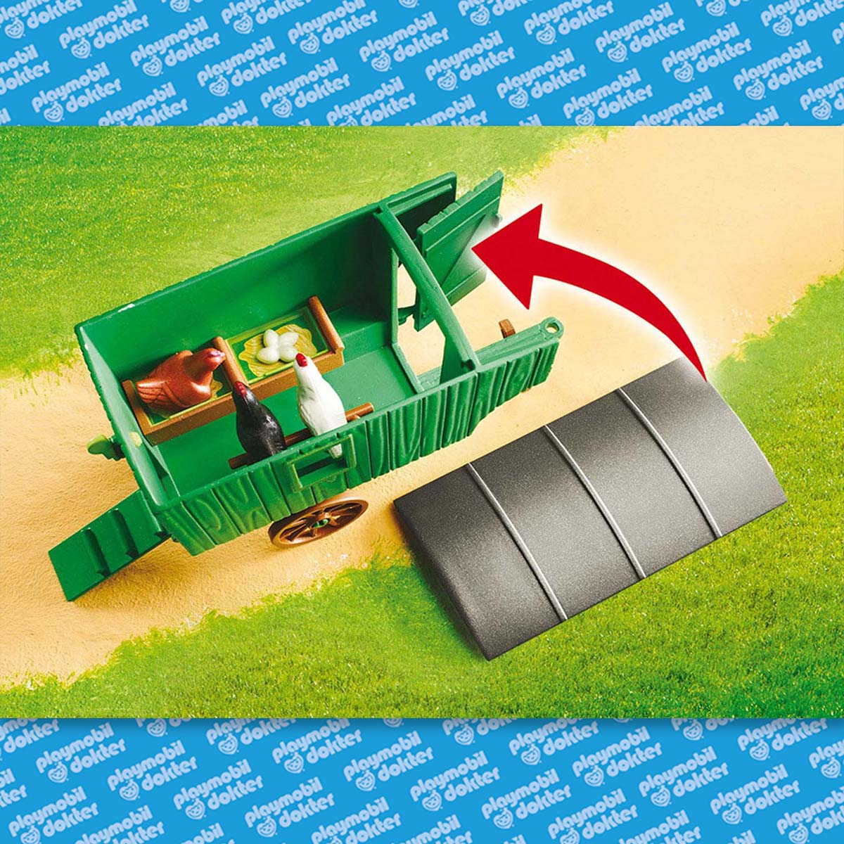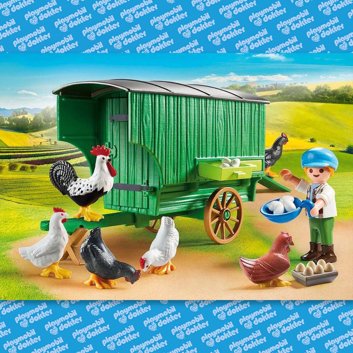 Kind met kippenhok. Dit Playmobil kippenhok is het huis van een trotse haan en zijn kippen. Laten we eens kijken hoeveel eieren de kippen vandaag hebben gelegd. De zoon van de boer legt de eieren voorzichtig in de doos. De kippen houden hem in de gaten maar ze laten de jongen gaan, hij brengt ze immers altijd lekker eten. Deze speelset bestaat uit een kippenhok op wielen, een kippentreden, een kippenhok, 4 kippen en 1 haan, eieren en 1 Playmobil speelfiguurtje. Deze speelset kan perfect gecombineerd worden met de Playmobil boerderij met silo en dieren (art. 70132).
