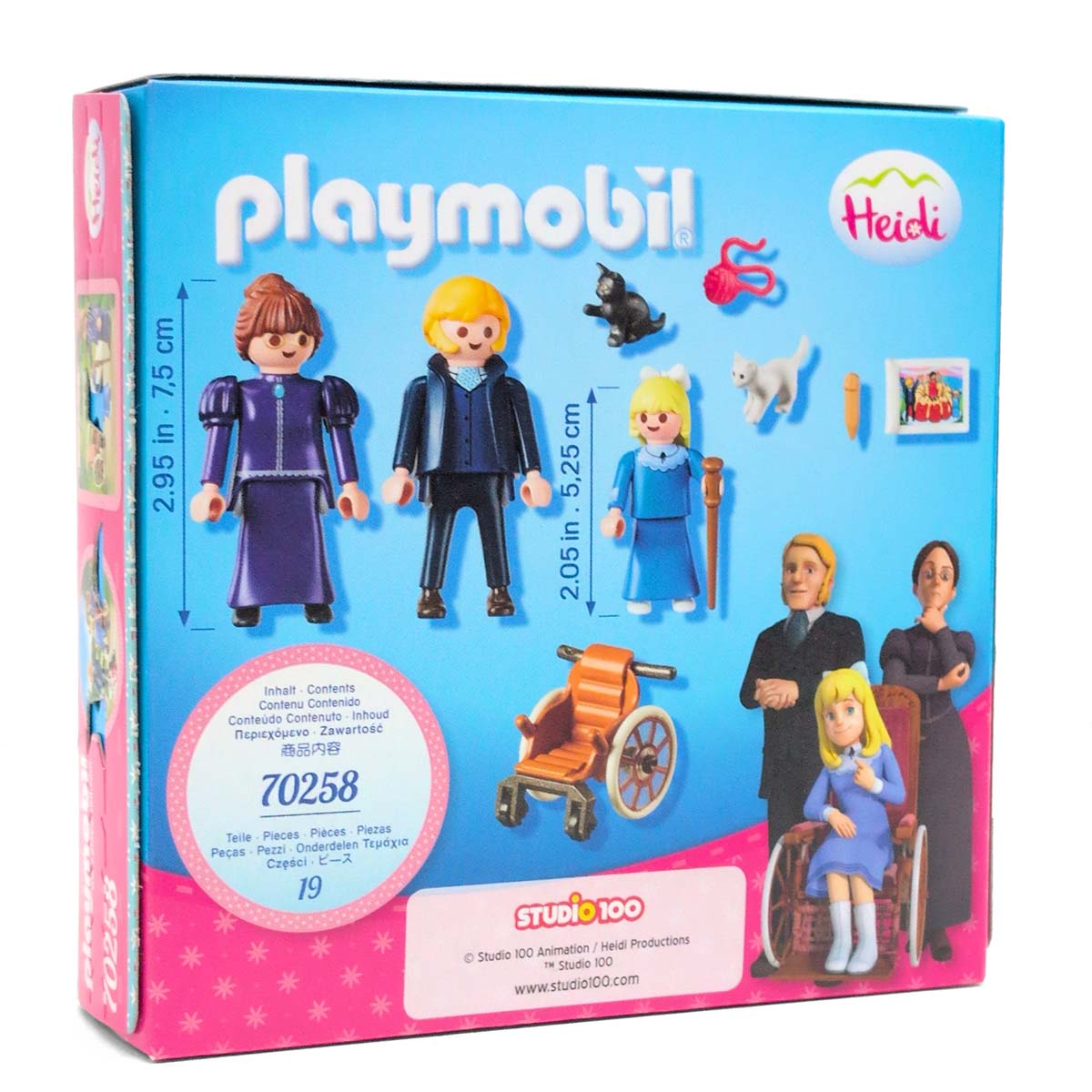 De speelset bestaat uit Clara met rolstoel, mejuffrouw Rottenmeier, Clara´s vader meneer Sesemann, twee kittens en nog veel meer extra´s.